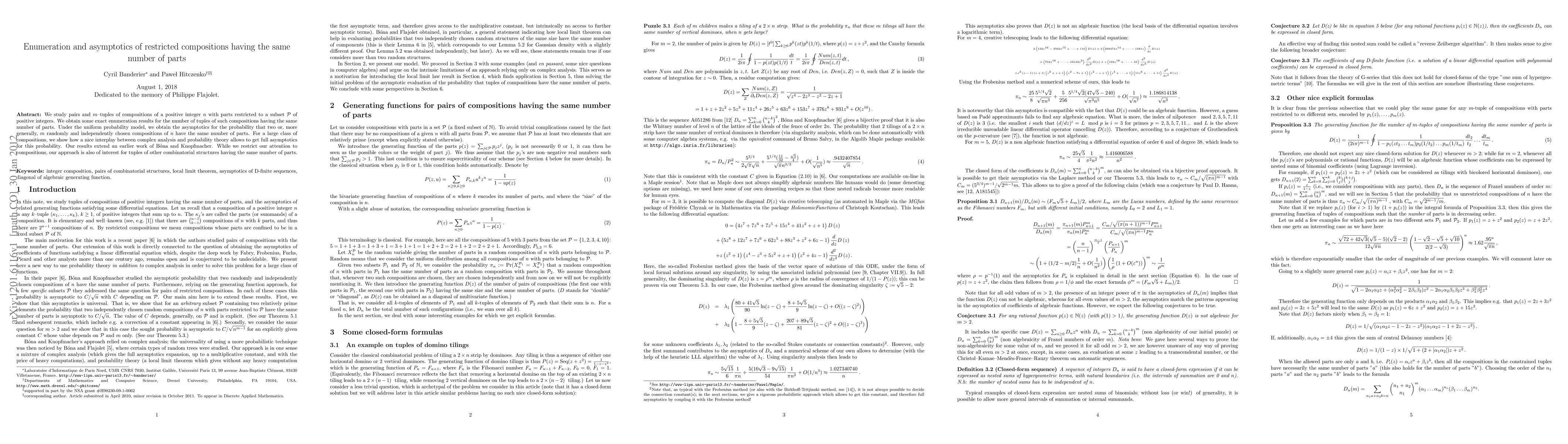 This paper enumerates and analyzes the asymptotics of compositions of a positive integer with parts restricted to a subset, focusing on pairs and tuples of such compositions having the same number of parts. It leverages complex analysis and probability theory to derive exact enumeration results and asymptotic probabilities for these compositions.