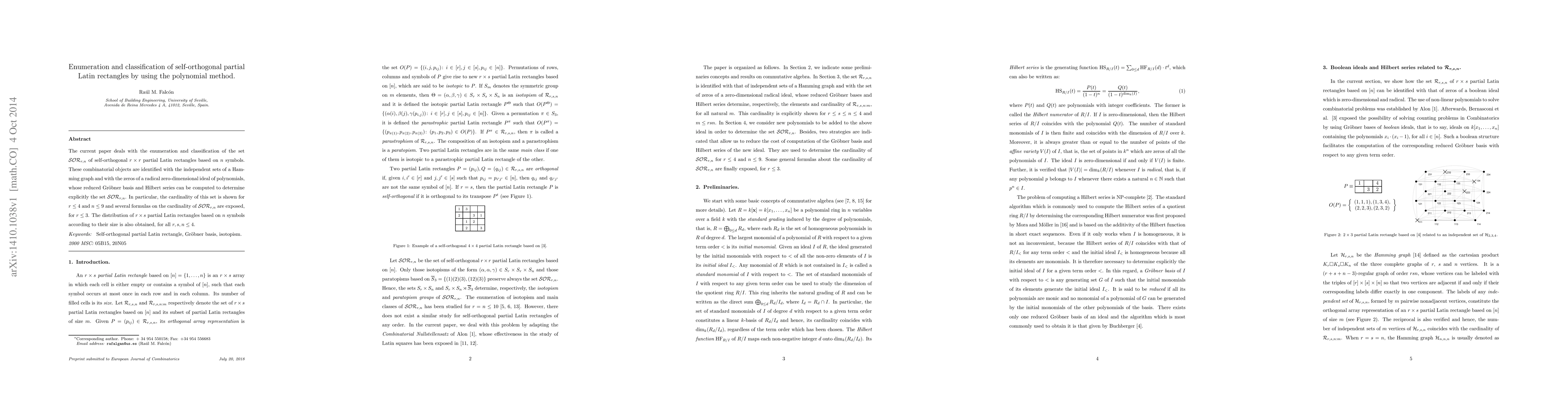 The current paper deals with the enumeration and classification of the set $\mathcal{SOR}_{r,n}$ of self-orthogonal $r\times r$ partial Latin rectangles based on $n$ symbols. These combinatorial objects are identified with the independent sets of a Hamming graph and with the zeros of a radical zero-dimensional ideal of polynomials, whose reduced Gr\"obner basis and Hilbert series can be computed to determine explicitly the set $\mathcal{SOR}_{r,n}$. In particular, the cardinality of this set is shown for $r\leq 4$ and $n\leq 9$ and several formulas on the cardinality of $\mathcal{SOR}_{r,n}$ are exposed, for $r\leq 3$. The distribution of $r\times s$ partial Latin rectangles based on $n$ symbols according to their size is also obtained, for all $r,s,n\leq 4$.