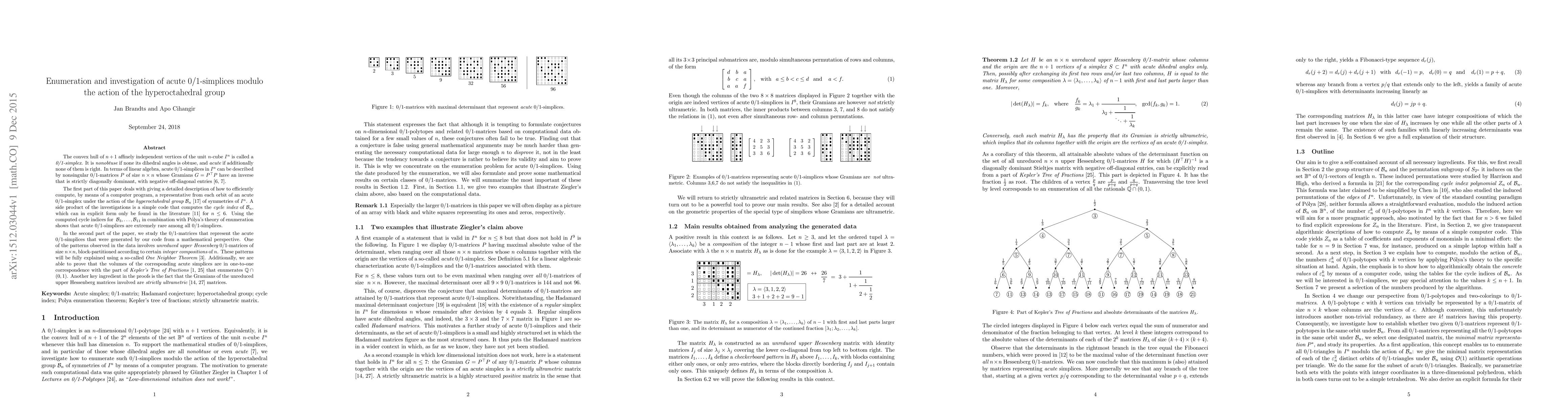 The convex hull of n+1 affinely independent vertices of the unit n-cube Cn is called a 0/1-simplex. It is nonobtuse if none its dihedral angles is obtuse, and acute if additionally none of them is right. In terms of linear algebra, acute 0/1-simplices in Cn can be described by nonsingular 0/1-matrices P of size n x n whose Gramians have an inverse that is strictly diagonally dominant, with negative off-diagonal entries. The first part of this paper deals with giving a detailed description of how to efficiently compute, by means of a computer program, a representative from each orbit of an acute 0/1-simplex under the action of the hyperoctahedral group Bn of symmetries of Cn. A side product of the investigations is a simple code that computes the cycle index of Bn, which can in explicit form only be found in the literature for n < 7. Using the computed cycle indices in combination with Polya's theory of enumeration shows that acute 0/1-simplices are extremely rare among all 0/1-simplices. In the second part of the paper, we study the 0/1-matrices that represent the acute 0/1-simplices that were generated by our code from a mathematical perspective. One of the patterns observed in the data involves unreduced upper Hessenberg 0/1-matrices of size n x n, block-partitioned according to certain integer compositions of n. These patterns will be fully explained using a so-called One Neighbor Theorem. Additionally, we are able to prove that the volumes of the corresponding acute simplices are in one-to-one correspondence with the part of Kepler's Tree of Fractions that enumerates the rationals between 0 and 1. Another key ingredient in the proofs is the fact that the Gramians of the unreduced upper Hessenberg matrices involved are strictly ultrametric matrices.