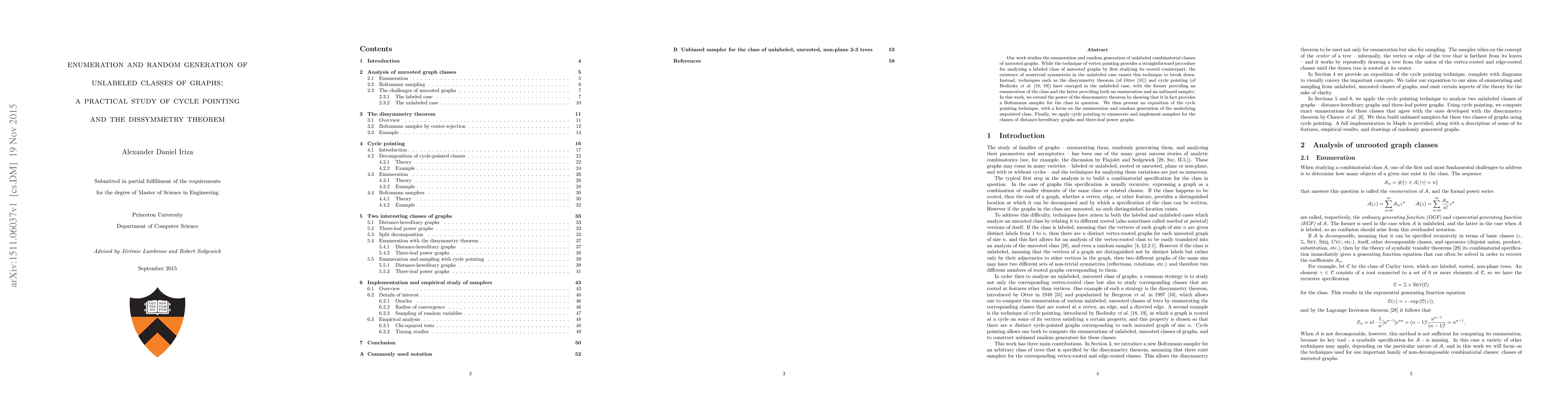 Our work studies the enumeration and random generation of unlabeled combinatorial classes of unrooted graphs. While the technique of vertex pointing provides a straightforward procedure for analyzing a labeled class of unrooted graphs by first studying its rooted counterpart, the existence of nontrivial symmetries in the unlabeled case causes this technique to break down. Instead, techniques such as the dissymmetry theorem (of Otter) and cycle pointing (of Bodirsky et al.) have emerged in the unlabeled case, with the former providing an enumeration of the class and the latter providing both an enumeration and an unbiased sampler. In this work, we extend the power of the dissymmetry theorem by showing that it in fact provides a Boltzmann sampler for the class in question. We then present an exposition of the cycle pointing technique, with a focus on the enumeration and random generation of the underlying unpointed class. Finally, we apply cycle pointing to enumerate and implement samplers for the classes of distance-hereditary graphs and three-leaf power graphs.