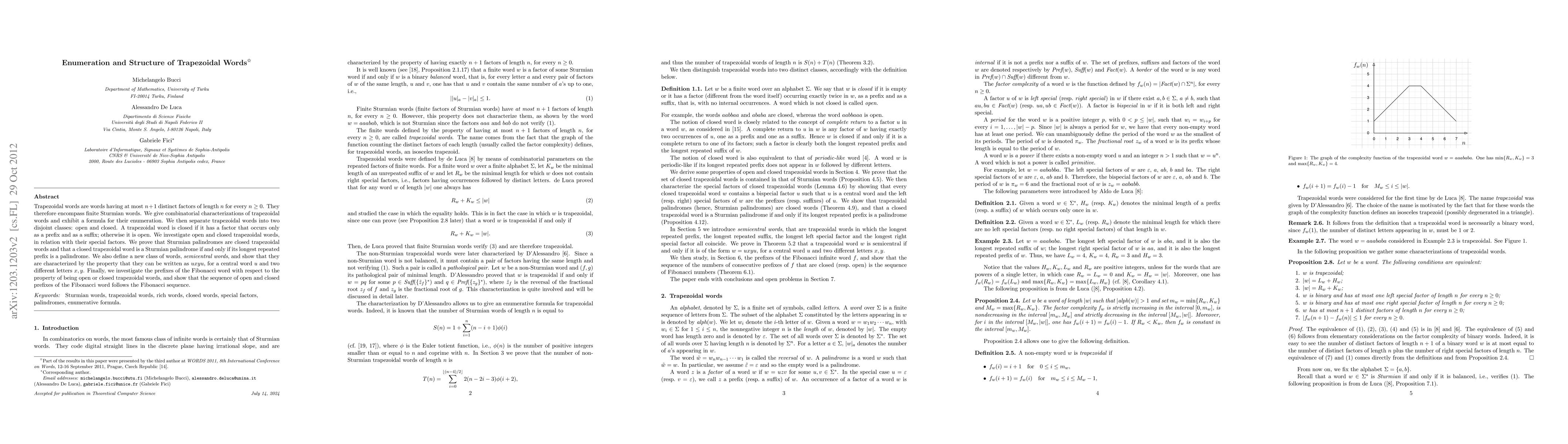 This paper enumerates and structurally characterizes trapezoidal words, which have at most $n+1$ distinct length-$n$ factors. It distinguishes between open and closed trapezoidal words, proving that Sturmian palindromes are a subset of closed ones, and introduces semicentral words defined by a specific form. It also analyzes the Fibonacci word's prefixes in terms of open and closed trapezoidal properties, revealing a Fibonacci sequence pattern.