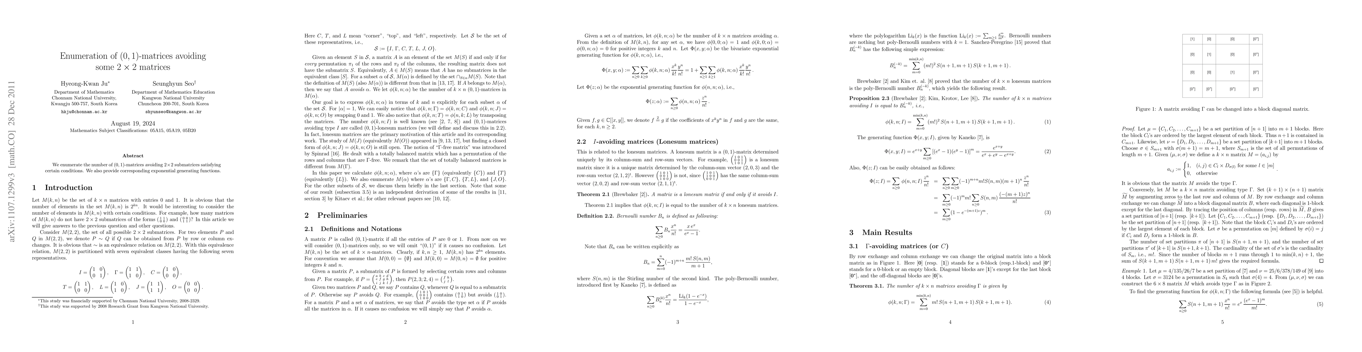 Summary: This paper counts the number of 0/1-matrices that do not contain specified 2x2 submatrices and presents the corresponding exponential generating functions for these enumerations.