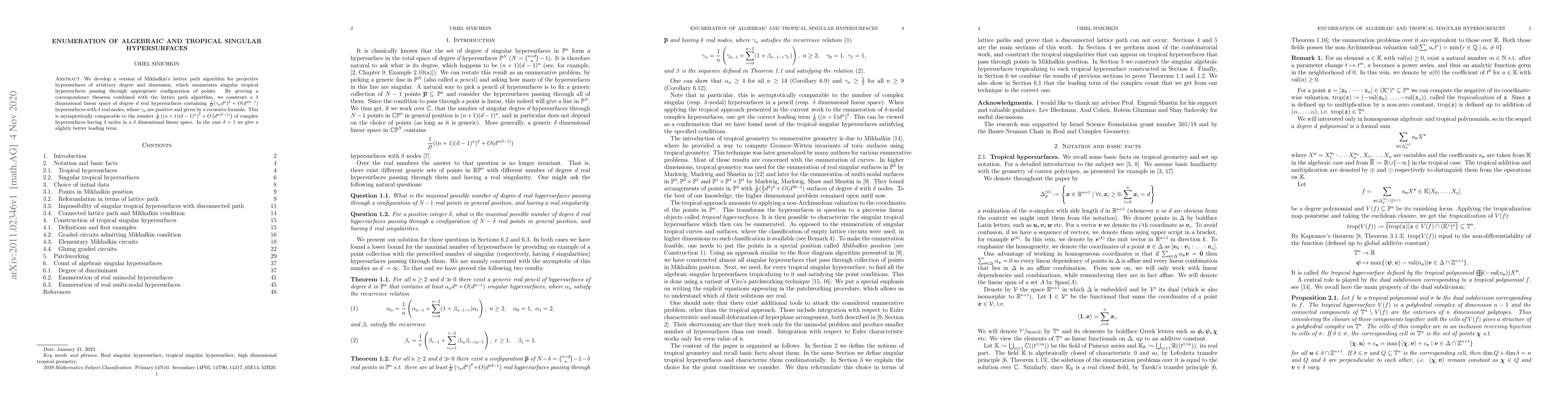 This paper develops a lattice path algorithm to enumerate singular tropical hypersurfaces and proves a correspondence theorem to construct a $\delta$ dimensional linear space of degree $d$ real hypersurfaces with $\delta$ real nodes, showing asymptotic equivalence to the number of complex hypersurfaces with $\delta$ nodes.