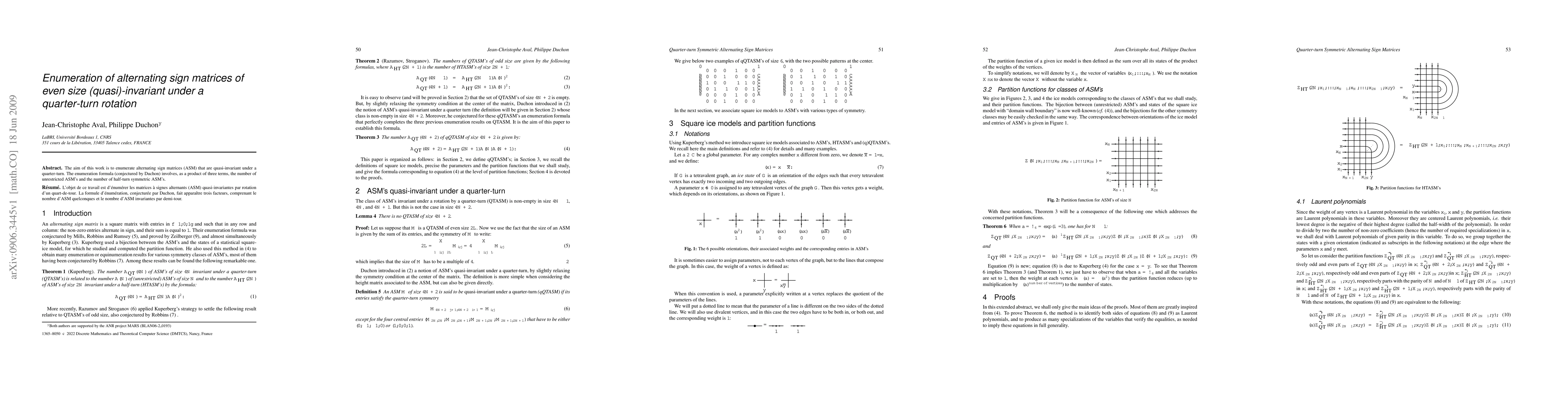 The aim of this work is to enumerate alternating sign matrices (ASM) that are quasi-invariant under a quarter-turn. The enumeration formula (conjectured by Duchon) involves, as a product of three terms, the number of unrestricted ASM's and the number of half-turn symmetric ASM's.