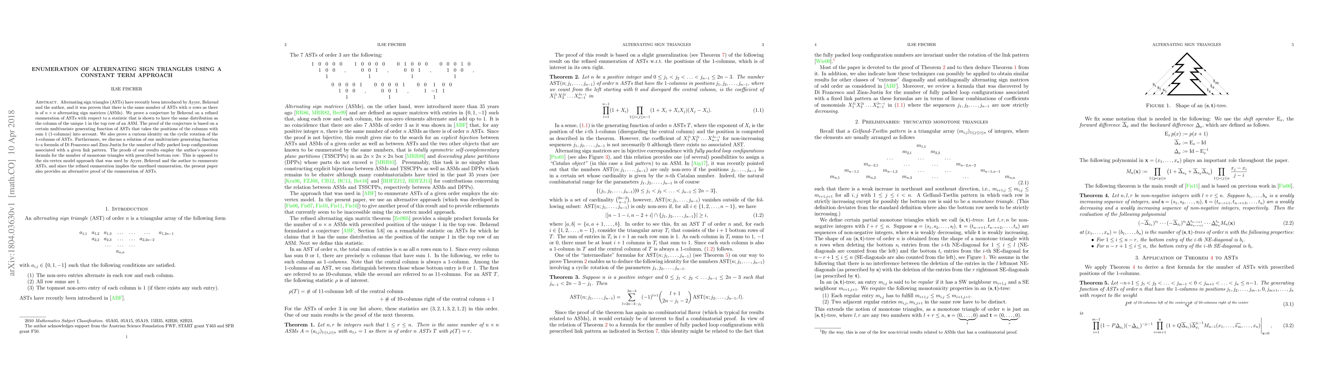 Researchers prove a conjecture on alternating sign triangles using a multivariate generating function that considers column positions with sum 1, providing an alternative proof to the enumeration of these structures.