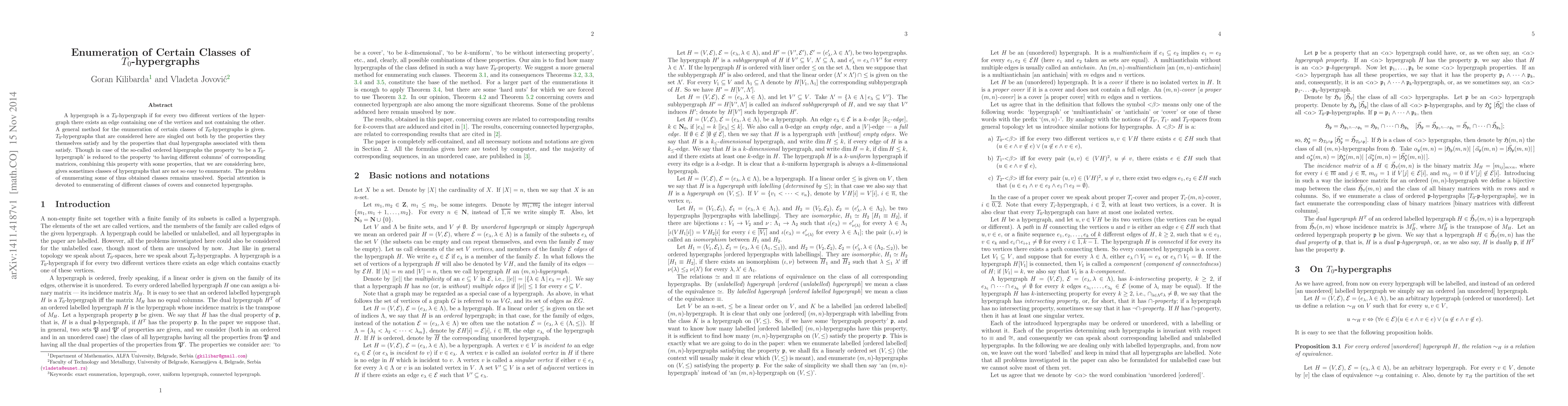 A hypergraph is a $T_0$-hypergraph if for every two different vertices of the hypergraph there exists an edge containing one of the vertices and not containing the other. A general method for the enumeration of certain classes of $T_0$-hypergraphs is given. $T_0$-hypergraphs that are considered here are singled out both by the properties they themselves satisfy and by the properties that dual hypergraphs associated with them satisfy. Though in case of the so-called ordered hipergraphs the property `to be a $T_0$-hypergraph' is reduced to the property `to having different columns' of corresponding matrices, combining this property with some properties, that we are considering here, gives sometimes classes of hypergraphs that are not so easy to enumerate. The problem of enumerating some of thus obtained classes remains unsolved. Special attention is devoted to enumerating of different classes of covers and connected hypergraphs.