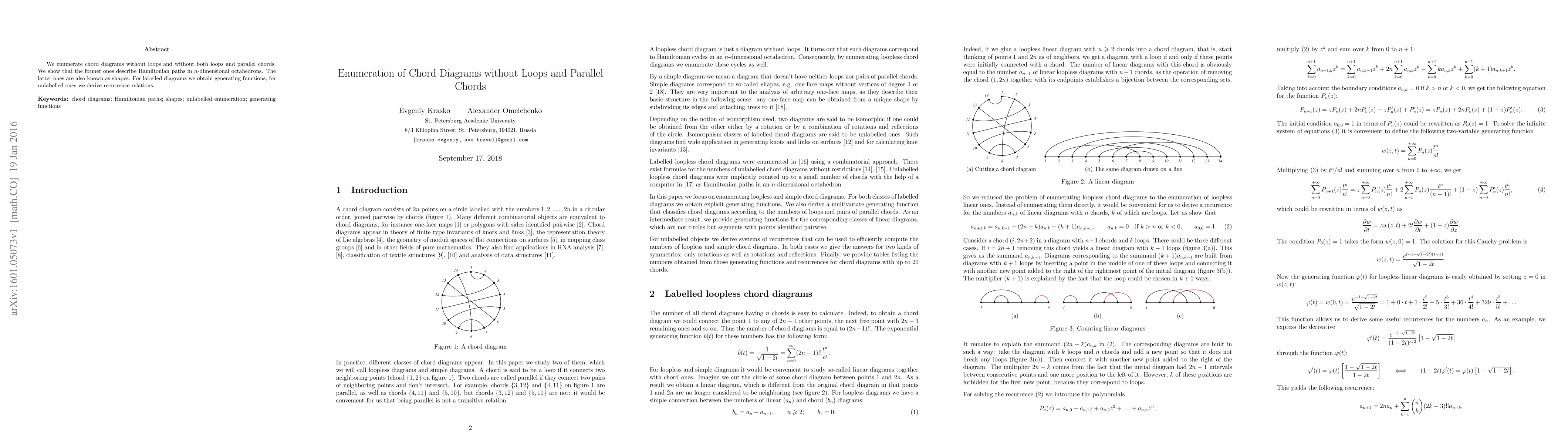 We enumerate chord diagrams without loops and without both loops and parallel chords. We show that the former ones describe Hamiltonian paths in $n$-dimensional octahedrons. The latter ones are also known as shapes. For labelled diagrams we obtain generating functions, for unlabelled ones we derive recurrence relations.