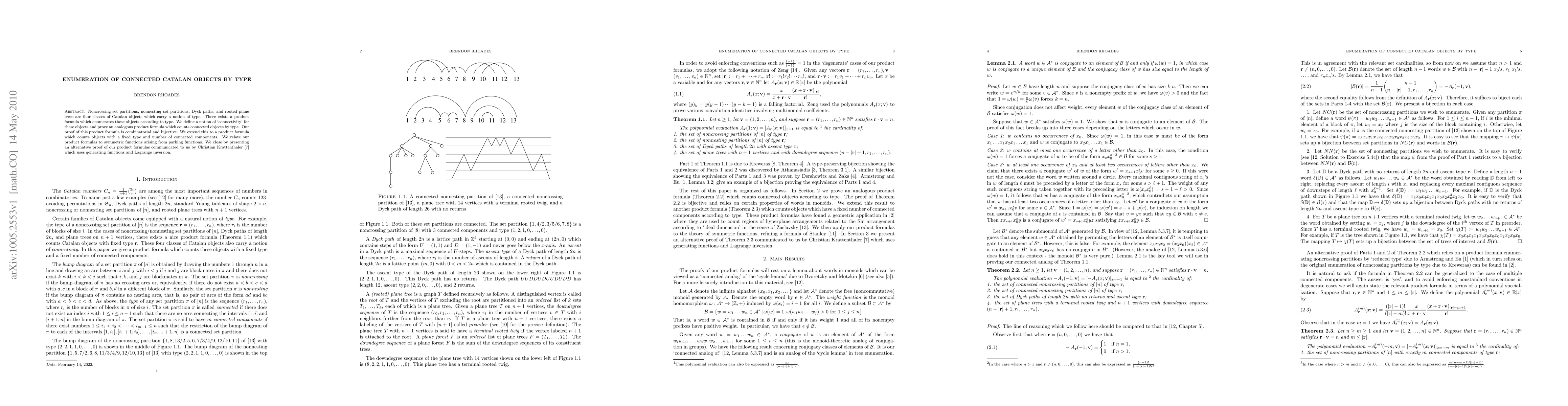 Noncrossing set partitions, nonnesting set partitions, Dyck paths, and rooted plane trees are four classes of Catalan objects which carry a notion of type. There exists a product formula which enumerates these objects according to type. We define a notion of `connectivity' for these objects and prove an analogous product formula which counts connected objects by type. Our proof of this product formula is combinatorial and bijective. We extend this to a product formula which counts objects with a fixed type and number of connected components. We relate our product formulas to symmetric functions arising from parking functions. We close by presenting an alternative proof of our product formulas communicated to us by Christian Krattenthaler which uses generating functions and Lagrange inversion.