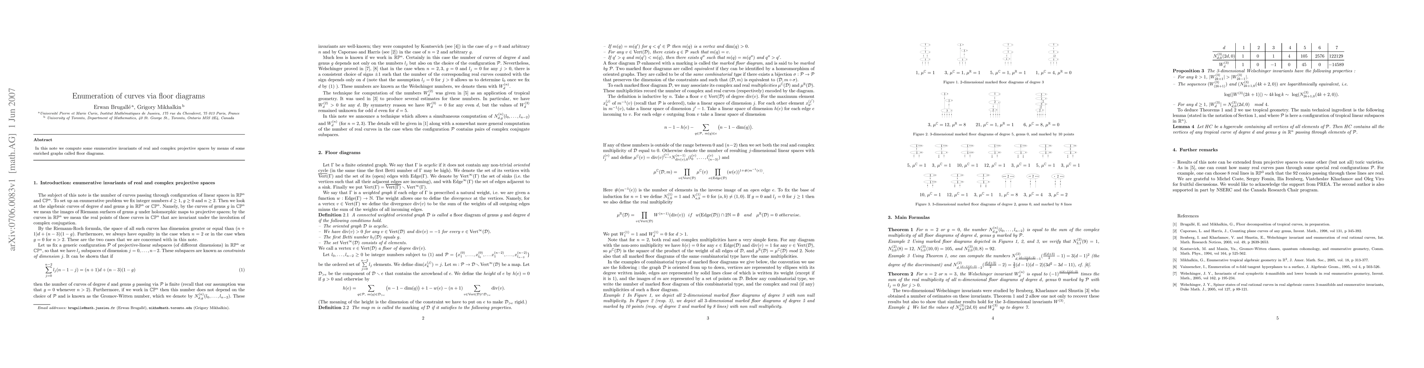 Summary: This paper enumerates curves in real and complex projective spaces using enriched graphs called floor diagrams to compute certain enumerative invariants. The approach provides a novel method for understanding these geometric structures.
