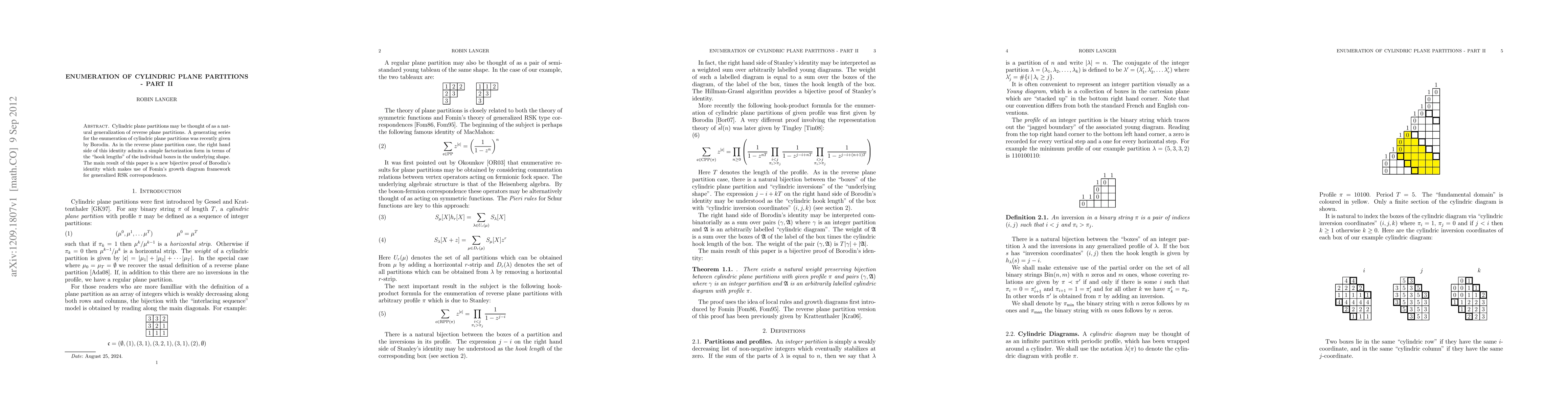 The paper presents a bijective proof of Borodin's identity for the enumeration of cylindric plane partitions using Fomin's growth diagram framework for generalized RSK correspondences.