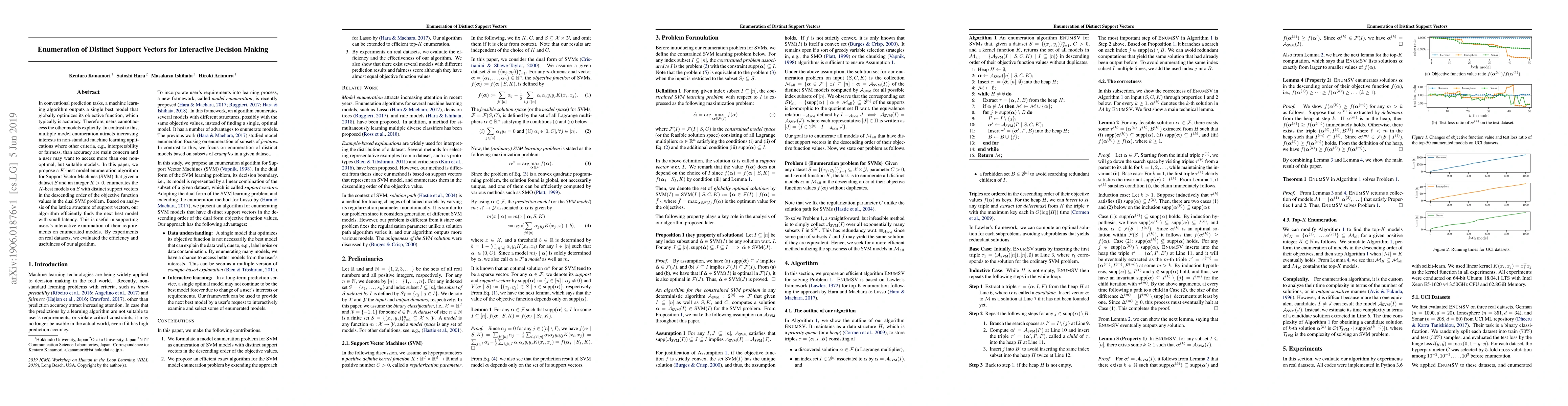 This paper presents a K-best model enumeration algorithm for Support Vector Machines (SVM) that identifies the top K models with distinct support vectors, aiding users in interactive decision-making by providing multiple suitable models beyond the globally optimal one. The algorithm leverages the lattice structure of support vectors to efficiently find the next best model, validated through experiments on real datasets.