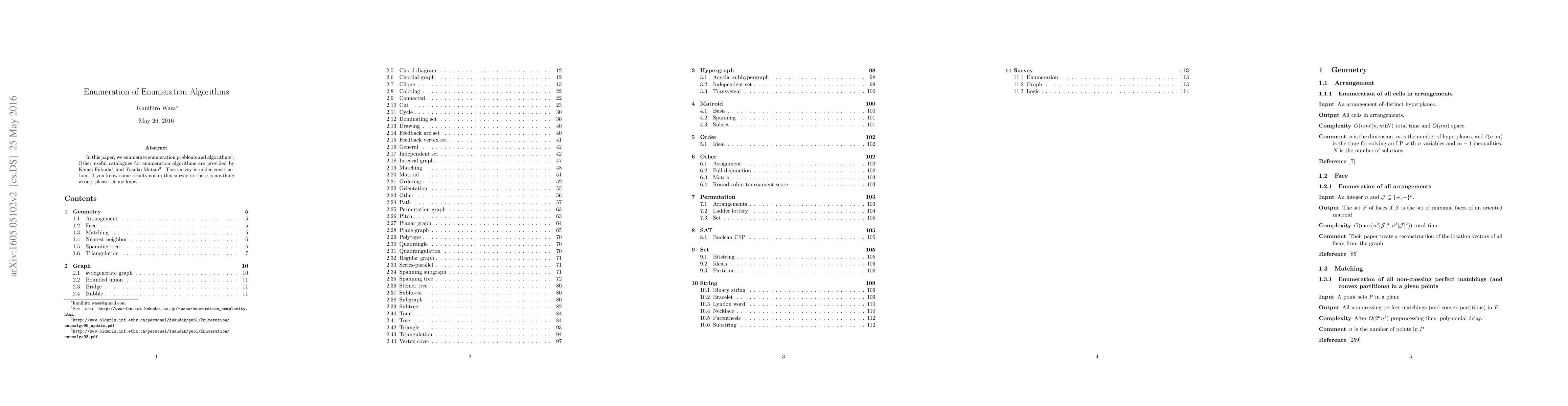 This paper enumerates enumeration problems and algorithms, highlighting key findings from an ongoing survey of existing results. It aims to provide a comprehensive overview of the field, but is currently under construction.