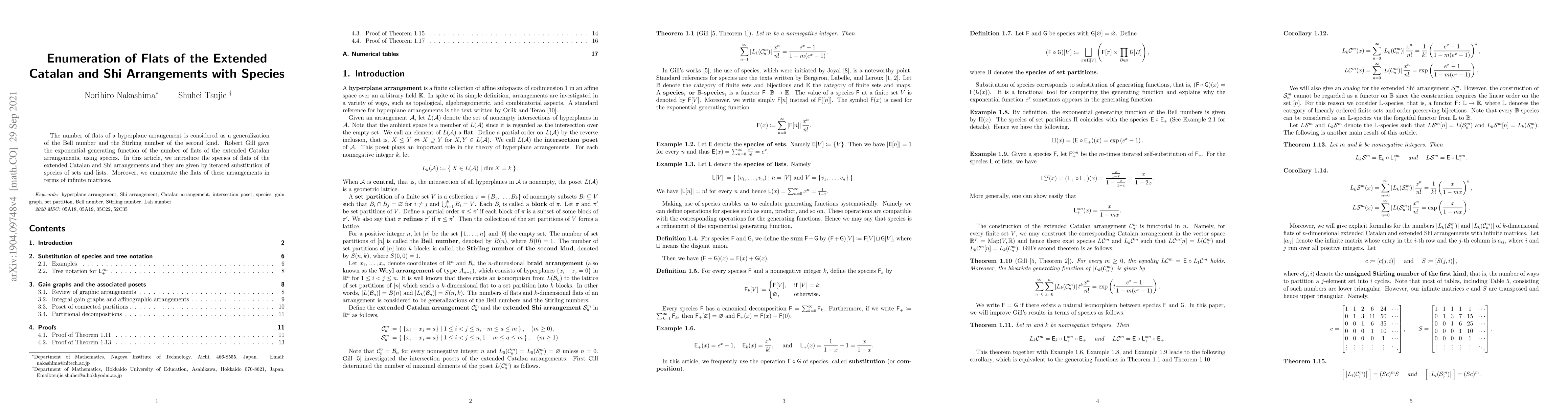 The number of flats of a hyperplane arrangement is considered as a generalization of the Bell number and the Stirling number of the second kind. Robert Gill gave the exponential generating function of the number of flats of the extended Catalan arrangements, using species. In this article, we introduce the species of flats of the extended Catalan and Shi arrangements and they are given by iterated substitution of species of sets and lists. Moreover, we enumerate the flats of these arrangements in terms of infinite matrices.