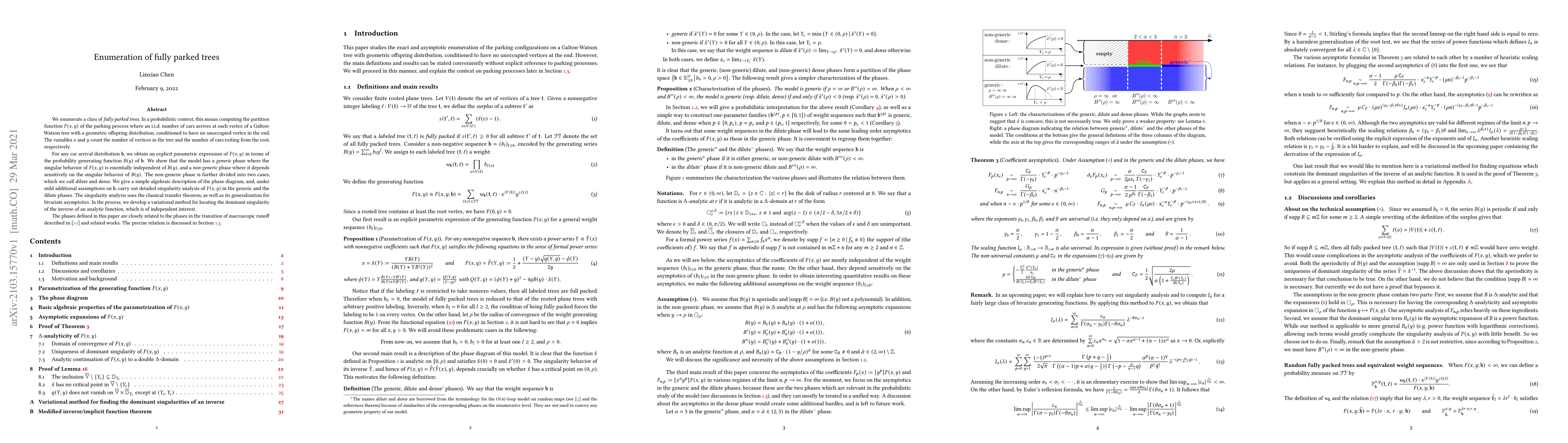 We enumerate a class of fully parked trees. In a probabilistic context, this means computing the partition function $F(x,y)$ of the parking process where an i.i.d. number of cars arrives at each vertex of a Galton-Watson tree with a geometric offspring distribution, conditioned to leave no vertex unoccupied at the end. The variables $x$ and $y$ count the number of vertices in the tree and the number of cars exiting from the root, respectively. For any car arrival distribution $\mathbf b$, we obtain an explicit parametric expression of $F(x,y)$ in terms of the probability generating function $B(y)$ of $\mathbf b$. We show that the model has a generic phase where the singular behavior of $F(x,y)$ is essentially independent of $B(y)$, and a non-generic phase where it depends sensitively on the singular behavior of $B(y)$. The non-generic phase is further divided into two cases, which we call dilute and dense. We give a simple algebraic description of the phase diagram, and, under mild additional assumptions on $\mathbf b$, carry out detailed singularity analysis of $F(x,y)$ in the generic and the dilute phases. The singularity analysis uses the classical transfer theorem, as well as its generalization for bivariate asymptotics. In the process, we develop a variational method for locating the dominant singularity of the inverse of an analytic function, which is of independent interest. The phases defined in this paper are closely related to, but not the same as, the phases in the transition of macroscopic runoff described in arxiv:1912.06012 and related works.