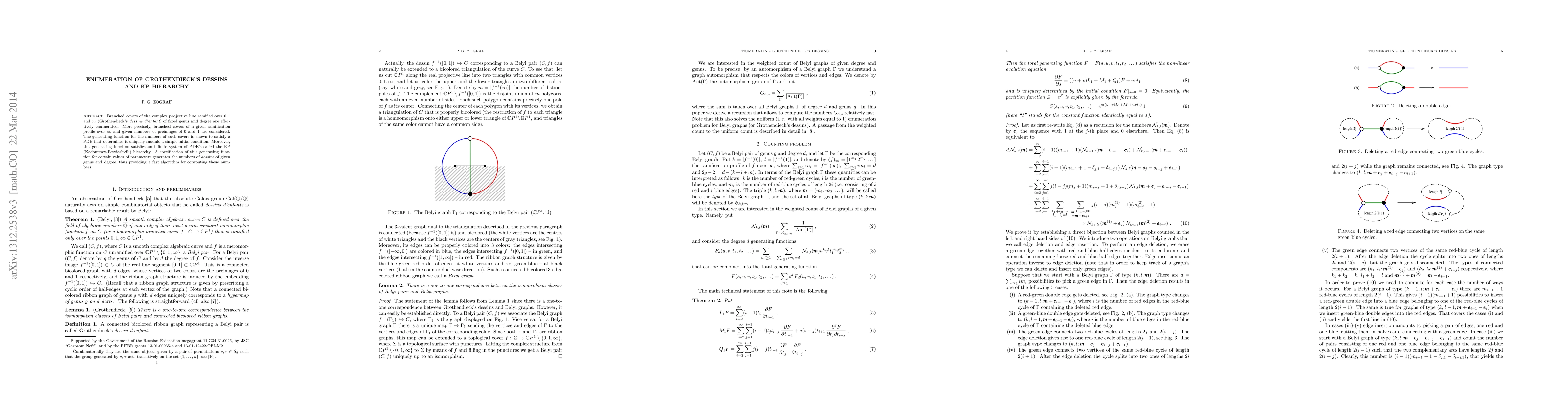 Branched covers of the complex projective line ramified over $0,1$ and $\infty$ (Grothendieck's {\em dessins d'enfant}) of fixed genus and degree are effectively enumerated. More precisely, branched covers of a given ramification profile over $\infty$ and given numbers of preimages of $0$ and $1$ are considered. The generating function for the numbers of such covers is shown to satisfy a PDE that determines it uniquely modulo a simple initial condition. Moreover, this generating function satisfies an infinite system of PDE's called the KP (Kadomtsev-Petviashvili) hierarchy. A specification of this generating function for certain values of parameters generates the numbers of {\em dessins} of given genus and degree, thus providing a fast algorithm for computing these numbers.