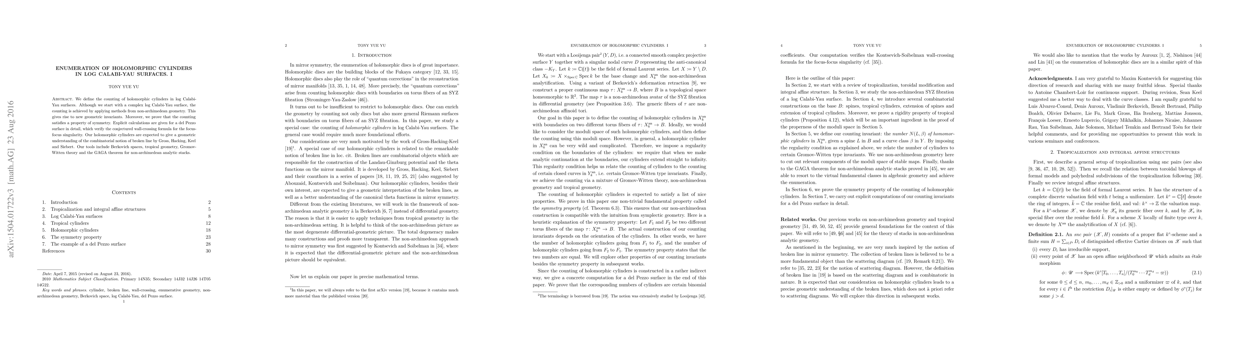 We define the counting of holomorphic cylinders in log Calabi-Yau surfaces. Although we start with a complex log Calabi-Yau surface, the counting is achieved by applying methods from non-archimedean geometry. This gives rise to new geometric invariants. Moreover, we prove that the counting satisfies a property of symmetry. Explicit calculations are given for a del Pezzo surface in detail, which verify the conjectured wall-crossing formula for the focus-focus singularity. Our holomorphic cylinders are expected to give a geometric understanding of the combinatorial notion of broken line by Gross, Hacking, Keel and Siebert. Our tools include Berkovich spaces, tropical geometry, Gromov-Witten theory and the GAGA theorem for non-archimedean analytic stacks.