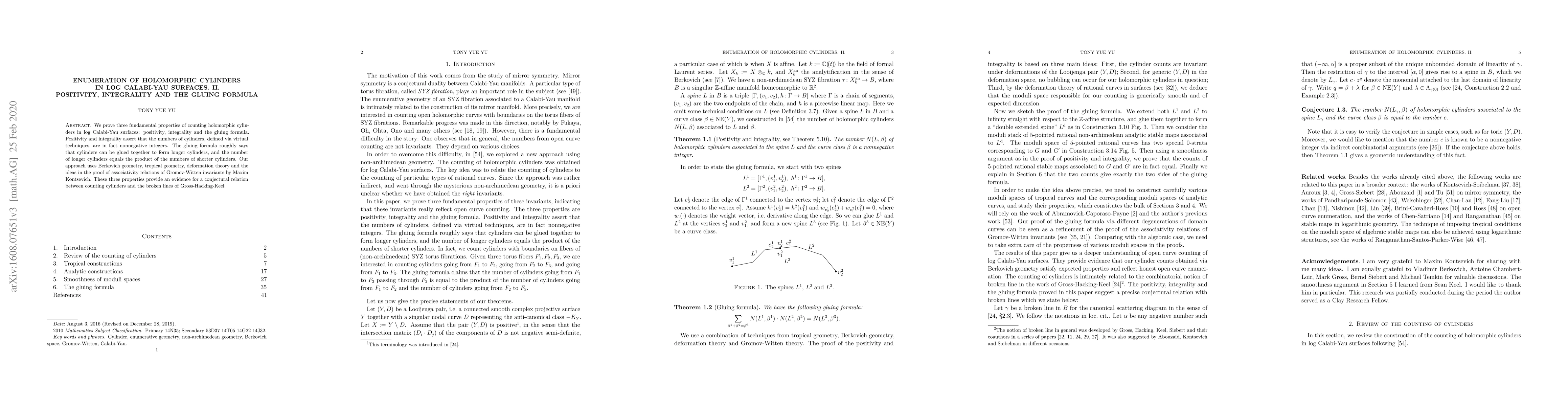 We prove three fundamental properties of counting holomorphic cylinders in log Calabi-Yau surfaces: positivity, integrality and the gluing formula. Positivity and integrality assert that the numbers of cylinders, defined via virtual techniques, are in fact nonnegative integers. The gluing formula roughly says that cylinders can be glued together to form longer cylinders, and the number of longer cylinders equals the product of the numbers of shorter cylinders. Our approach uses Berkovich geometry, tropical geometry, deformation theory and the ideas in the proof of associativity relations of Gromov-Witten invariants by Maxim Kontsevich. These three properties provide an evidence for a conjectural relation between counting cylinders and the broken lines of Gross-Hacking-Keel.