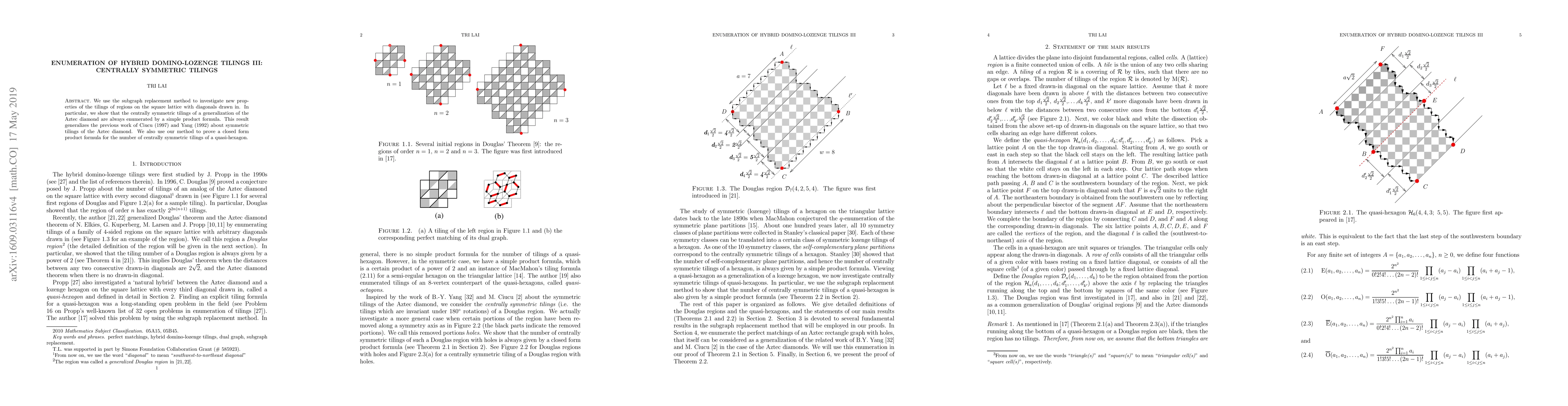 We use the subgraph replacement method to investigate new properties of the tilings of regions on the square lattice with diagonals drawn in. In particular, we show that the centrally symmetric tilings of a generalization of the Aztec diamond are always enumerated by a simple product formula. This result generalizes the previous work of Ciucu (1997) and Yang (1992) about symmetric tilings of the Aztec diamond. We also use our method to prove a closed-form product formula for the number of centrally symmetric tilings of a quasi-hexagon.