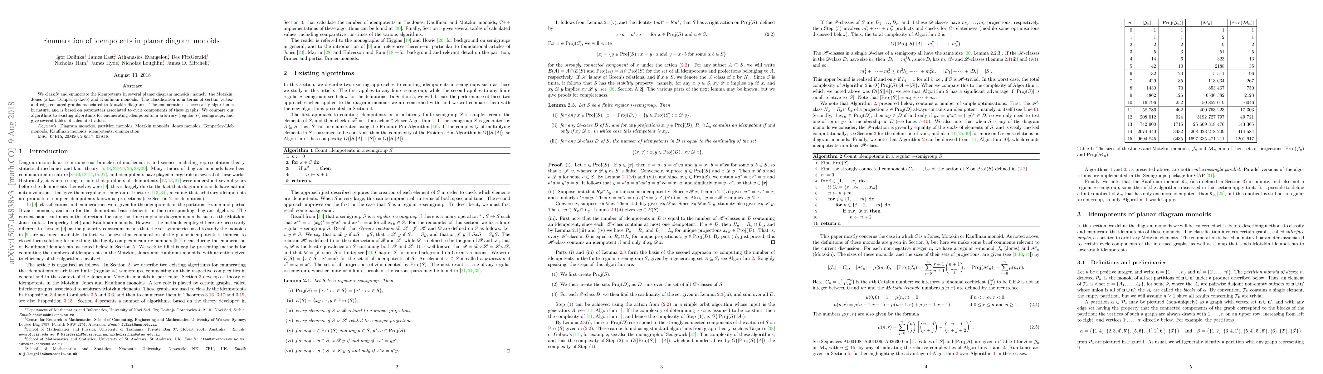 This paper classifies and enumerates idempotents in Motzkin, Jones, and Kauffman planar diagram monoids using vertex- and edge-coloured graphs. The enumeration is algorithmic, based on cycle components, and compared to existing methods for general semigroups, with tables of calculated values.
