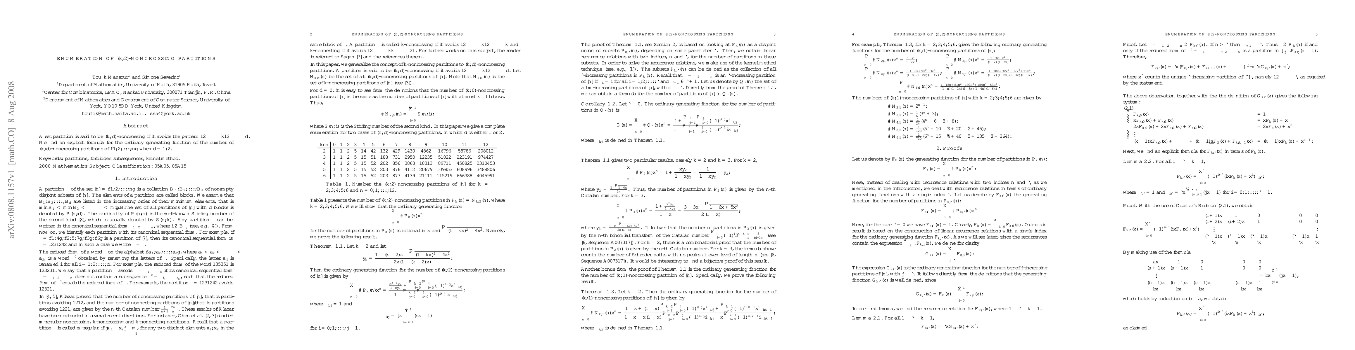 A set partition is said to be $(k,d)$-noncrossing if it avoids the pattern $12... k12... d$. We find an explicit formula for the ordinary generating function of the number of $(k,d)$-noncrossing partitions of $\{1,2,...,n\}$ when $d=1,2$.
