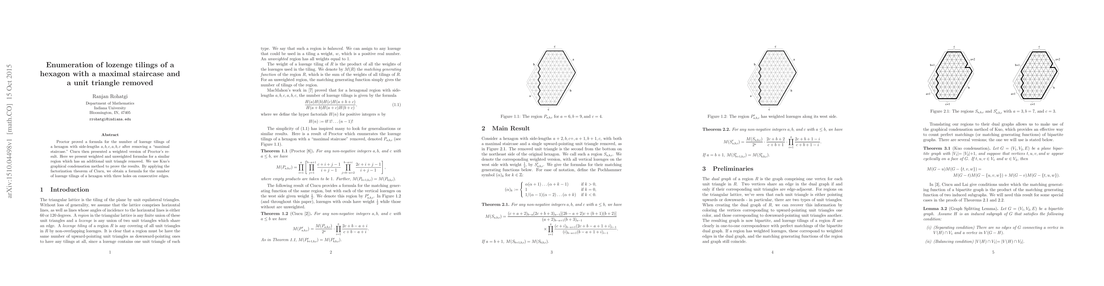 Proctor proved a formula for the number of lozenge tilings of a hexagon with side-lengths $a,b,c,a,b,c$ after removing a "maximal staircase." Ciucu then presented a weighted version of Proctor's result. Here we present weighted and unweighted formulas for a similar region which has an additional unit triangle removed. We use Kuo's graphical condensation method to prove the results. By applying the factorization theorem of Ciucu, we obtain a formula for the number of lozenge tilings of a hexagon with three holes on consecutive edges.