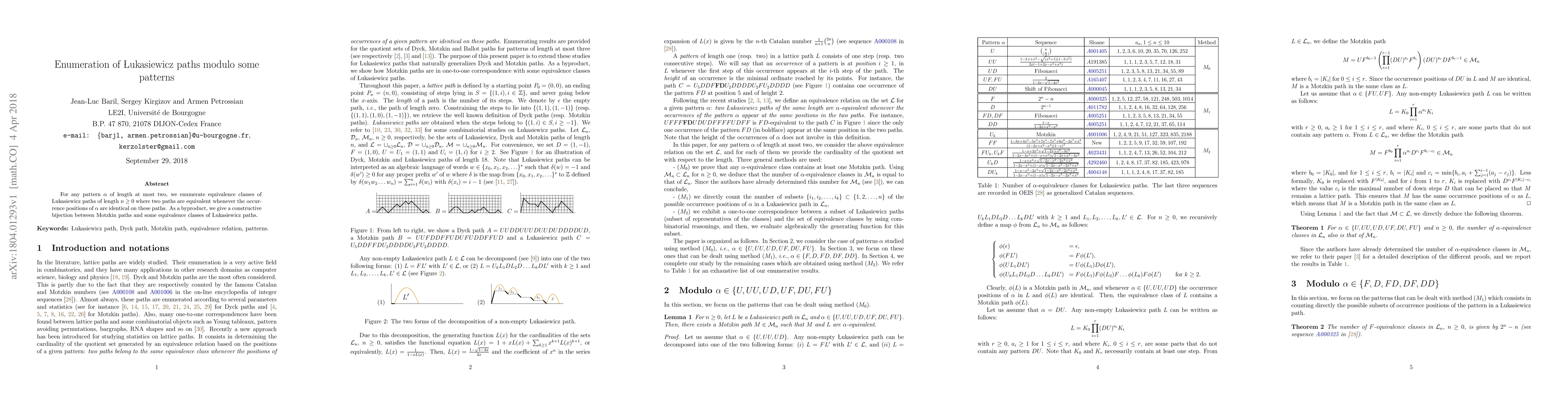 For any pattern $\alpha$ of length at most two, we enumerate equivalence classes of \L{}ukasiewicz paths of length $n\geq 0$ where two paths are equivalent whenever the occurrence positions of $\alpha$ are identical on these paths. As a byproduct, we give a constructive bijection between Motzkin paths and some equivalence classes of \L{}ukasiewicz paths.