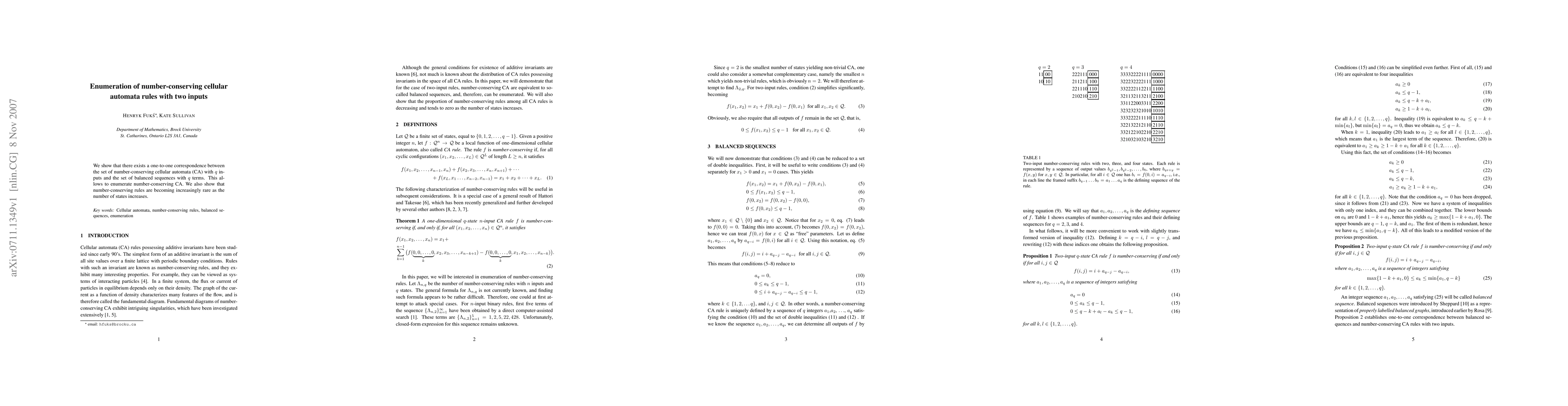The paper establishes a one-to-one correspondence between number-conserving cellular automata rules with q inputs and balanced sequences with q terms, allowing for the enumeration of such rules. It also reveals that these rules become increasingly rare as the number of states increases.