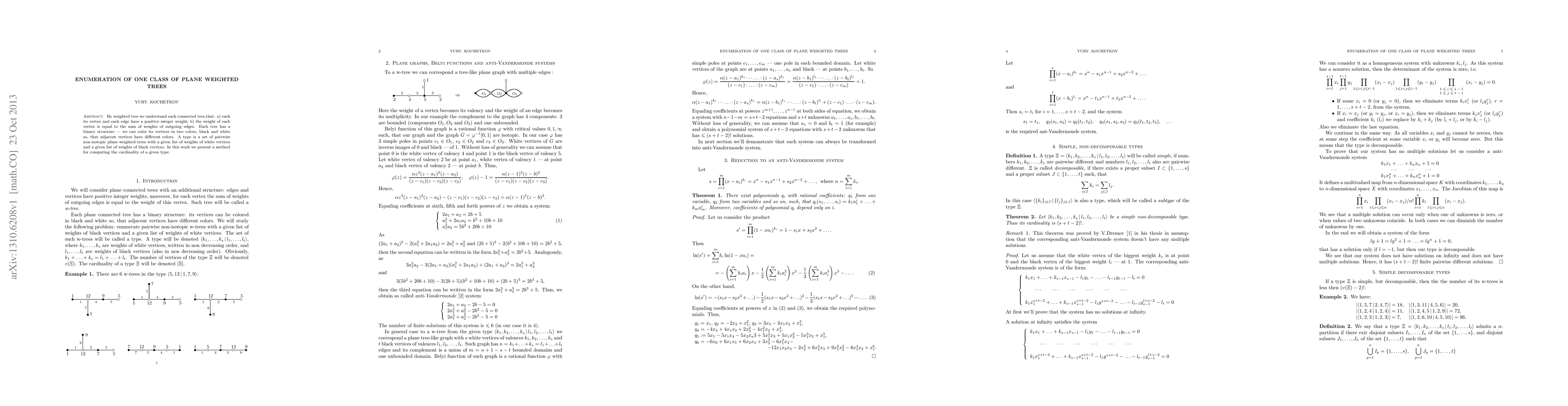 This paper presents a method for enumerating a specific class of plane weighted trees, where each tree has vertices and edges with positive integer weights, and the weight of each vertex equals the sum of its outgoing edges' weights. The method computes the cardinality of a given type of these trees, defined by distinct lists of white and black vertex weights.