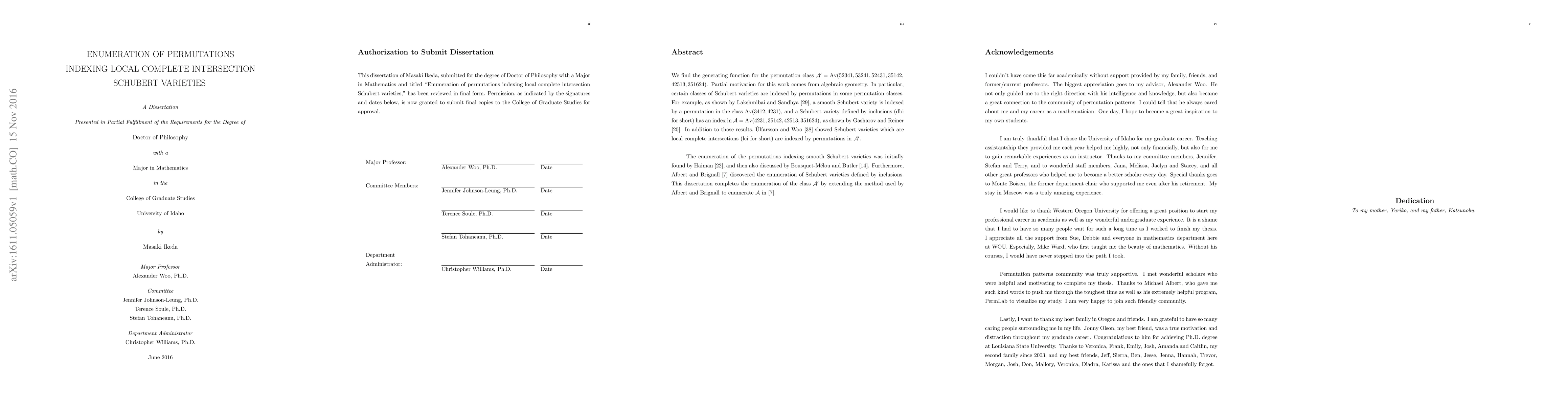We find the generating function for the permutation class $\mathcal{A}'=\text{Av}(52341,53241,52431,35142,42513,351624)$ whose permutations index local complete intersection Schubert varieties. The method we apply is the extension of how Albert and Brignall discover the generating function for $\mathcal{A}=\text{Av}(4231,35142,42513,351624)$ in their paper. This completes the enumerations of all classical permutation classes indexing certain types of Schubert varieties.