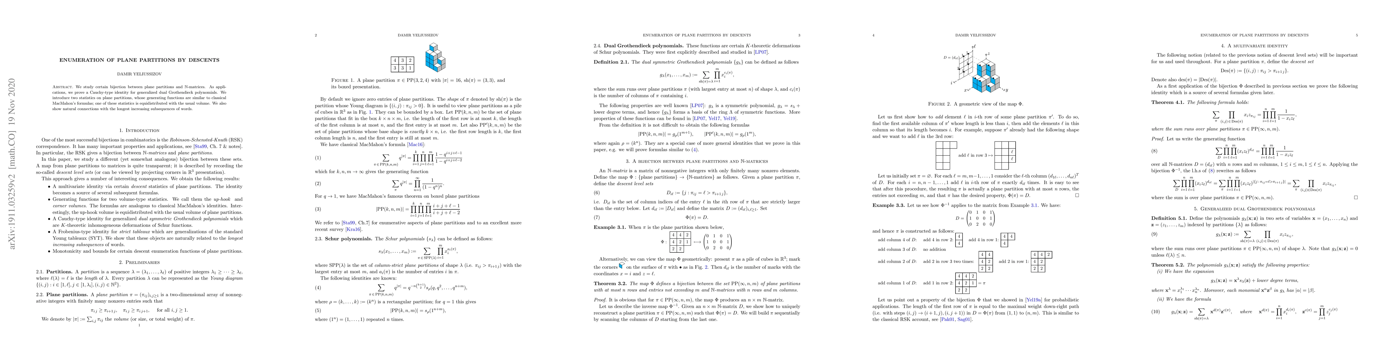 We study certain bijection between plane partitions and $\mathbb{N}$-matrices. As applications, we prove a Cauchy-type identity for generalized dual Grothendieck polynomials. We introduce two statistics on plane partitions, whose generating functions are similar to classical MacMahon's formulas; one of these statistics is equidistributed with the usual volume. We also show natural connections with the longest increasing subsequences of words.