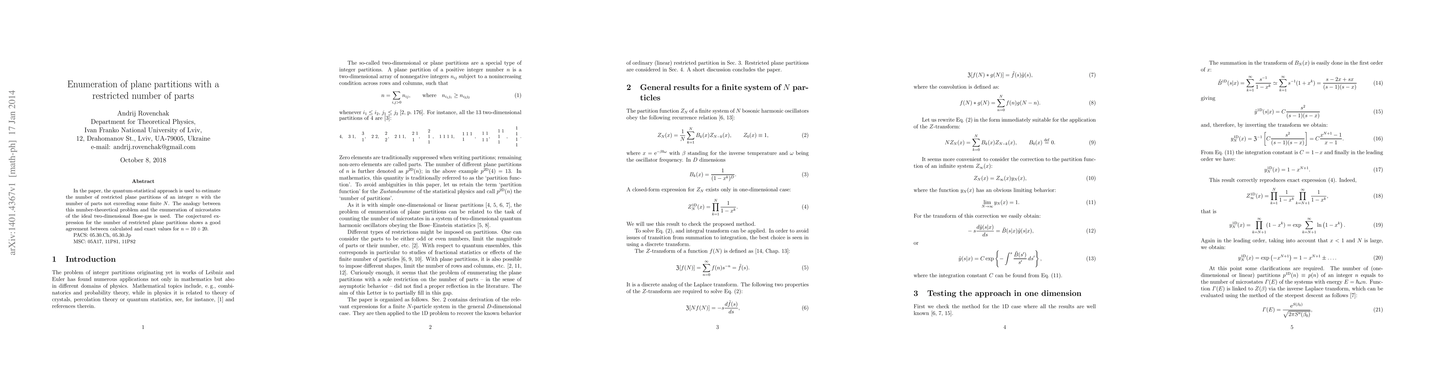The research employs a quantum-statistical approach to estimate the number of restricted plane partitions of an integer n with parts not exceeding a finite N. It draws an analogy between this problem and the enumeration of microstates of an ideal two-dimensional Bose-gas.