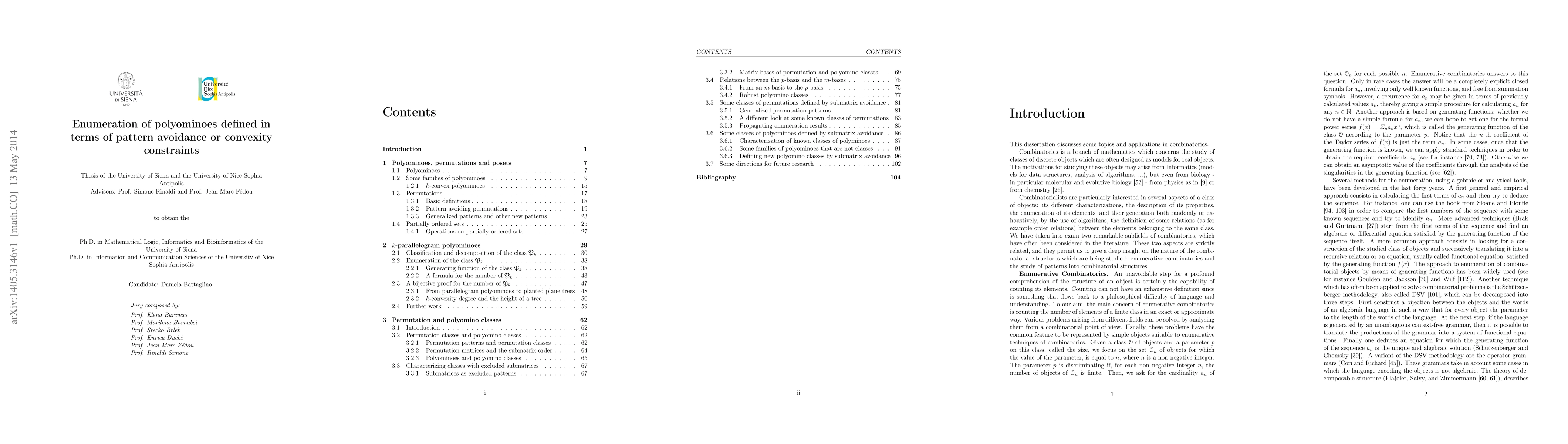 In this thesis, we consider the problem of characterizing and enumerating sets of polyominoes described in terms of some constraints, defined either by convexity or by pattern containment. We are interested in a well known subclass of convex polyominoes, the k-convex polyominoes for which the enumeration according to the semi-perimeter is known only for k=1,2. We obtain, from a recursive decomposition, the generating function of the class of k-convex parallelogram polyominoes, which turns out to be rational. Noting that this generating function can be expressed in terms of the Fibonacci polynomials, we describe a bijection between the class of k-parallelogram polyominoes and the class of planted planar trees having height less than k+3. In the second part of the thesis we examine the notion of pattern avoidance, which has been extensively studied for permutations. We introduce the concept of pattern avoidance in the context of matrices, more precisely permutation matrices and polyomino matrices. We present definitions analogous to those given for permutations and in particular we define polyomino classes, i.e. sets downward closed with respect to the containment relation. So, the study of the old and new properties of the redefined sets of objects has not only become interesting, but it has also suggested the study of the associated poset. In both approaches our results can be used to treat open problems related to polyominoes as well as other combinatorial objects.