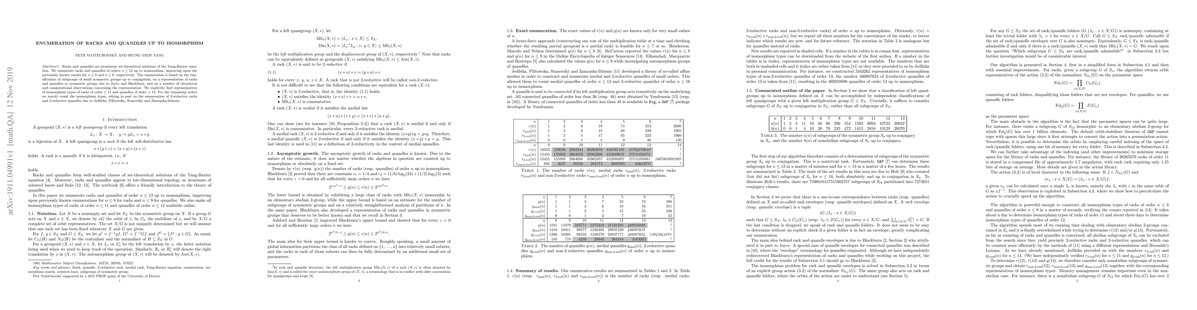 Racks and quandles are prominent set-theoretical solutions of the Yang-Baxter equation. We enumerate racks and quandles of orders $n\le 13$ up to isomorphism, improving upon the previously known results for $n\le 8$ and $n\le 9$, respectively. The enumeration is based on the classification of subgroups of small symmetric groups up to conjugation, on a representation of racks and quandles in symmetric groups due to Joyce and Blackburn, and on a number of theoretical and computational observations concerning the representation. We explicitly find representatives of isomorphism types of racks of order $\le 11$ and quandles of order $\le 12$. For the remaining orders we merely count the isomorphism types, relying in part on the enumeration of $2$-reductive racks and $2$-reductive quandles due to Jedli\v{c}ka, Pilitowska, Stanovsk\'y and Zamojska-Dzienio.