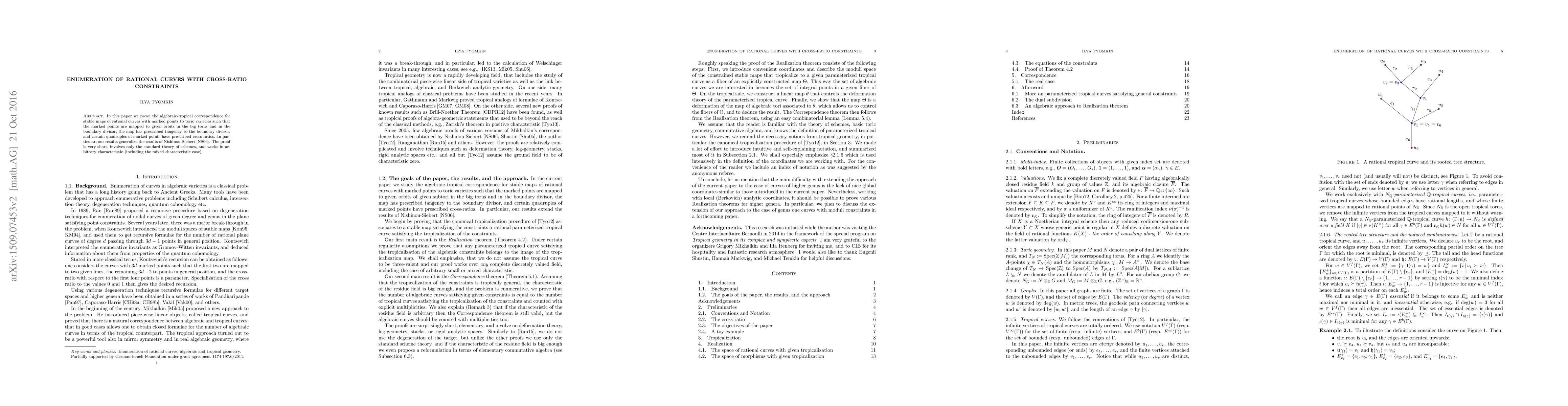 In this paper we prove the algebraic-tropical correspondence for stable maps of rational curves with marked points to toric varieties such that the marked points are mapped to given orbits in the big torus and in the boundary divisor, the map has prescribed tangency to the boundary divisor, and certain quadruples of marked points have prescribed cross-ratios. In particular, our results generalize the results of Nishinou and Siebert. The proof is very short, involves only the standard theory of schemes, and works in arbitrary characteristic (including the mixed characteristic case).