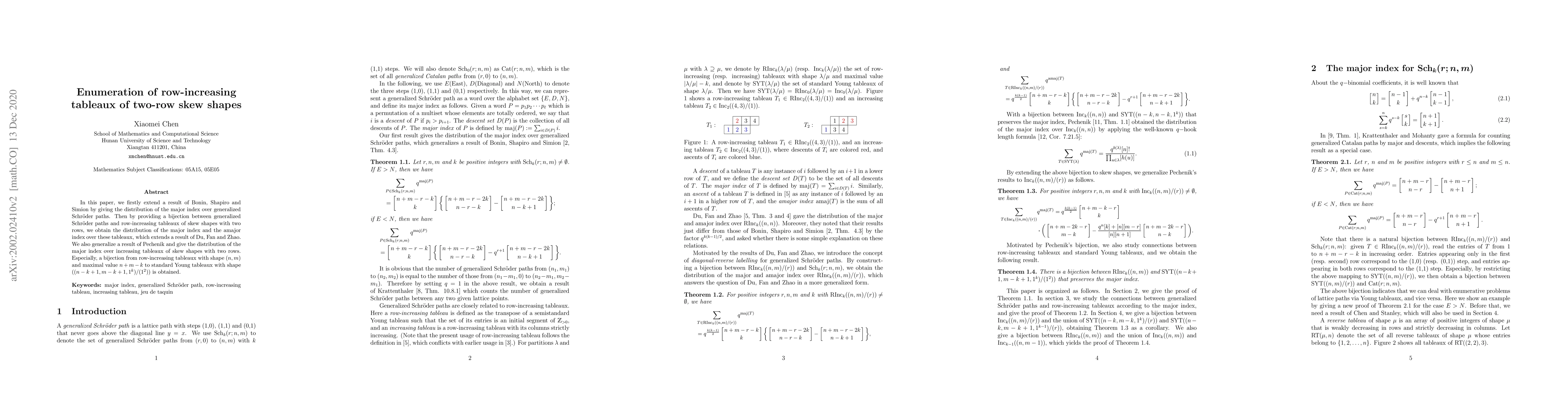 This paper extends results on the major index distribution by connecting generalized Schröder paths to row-increasing tableaux of two-row skew shapes, deriving the major index distribution for these tableaux, and establishing a bijection linking these tableaux to standard Young tableaux with specific shapes.