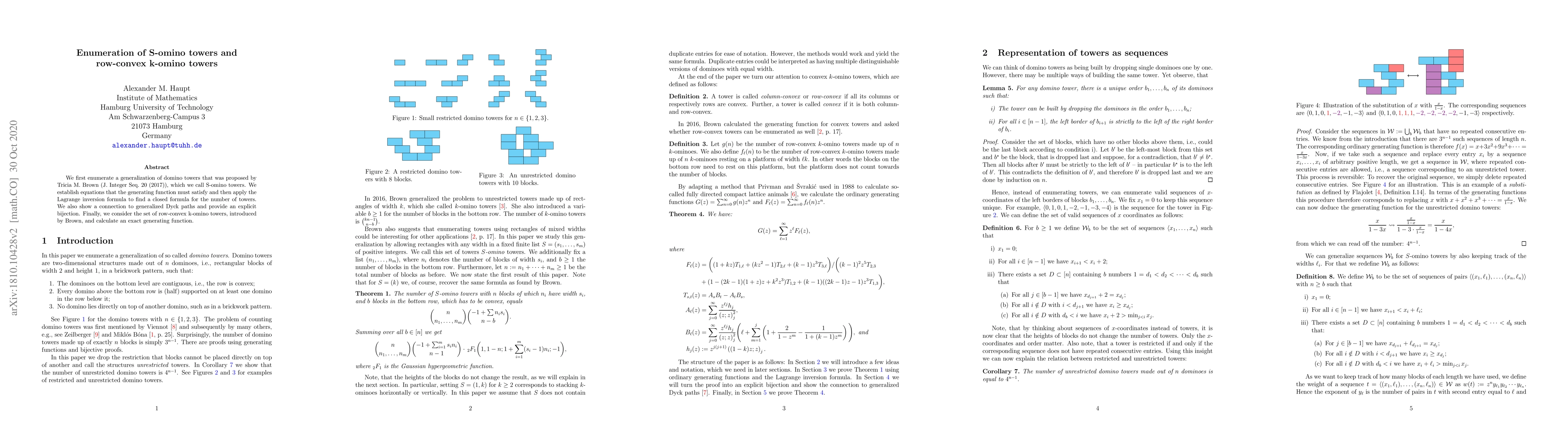 We first enumerate a generalization of domino towers that was proposed by Tricia M. Brown (J. Integer Seq. 20 (2017)), which we call S-omino towers. We establish equations that the generating function must satisfy and then apply the Lagrange inversion formula to find a closed formula for the number of towers. We also show a connection to generalized Dyck paths and provide an explicit bijection. Finally, we consider the set of row-convex k-omino towers, introduced by Brown, and calculate an exact generating function.