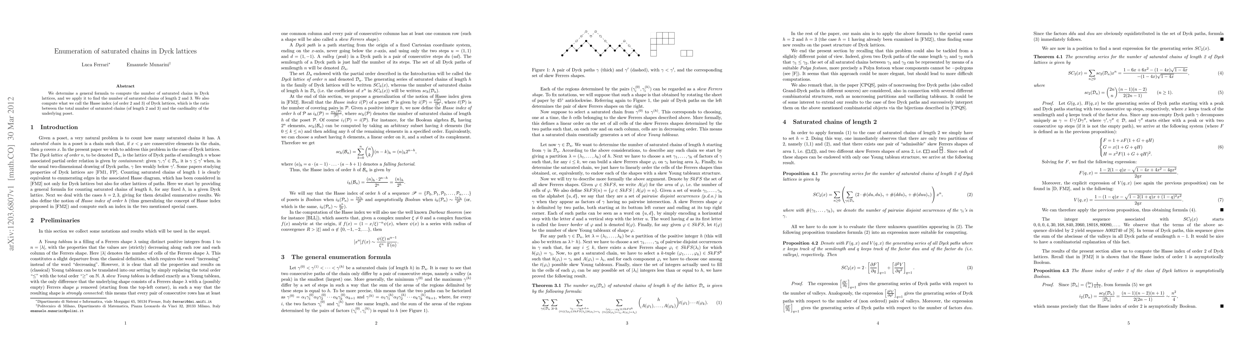 This paper provides a formula for calculating the number of saturated chains in Dyck lattices and applies it to determine these chains' counts for lengths 2 and 3. It also introduces the Hasse index of order 2 and 3, measuring the ratio of these chains to the poset's cardinality.