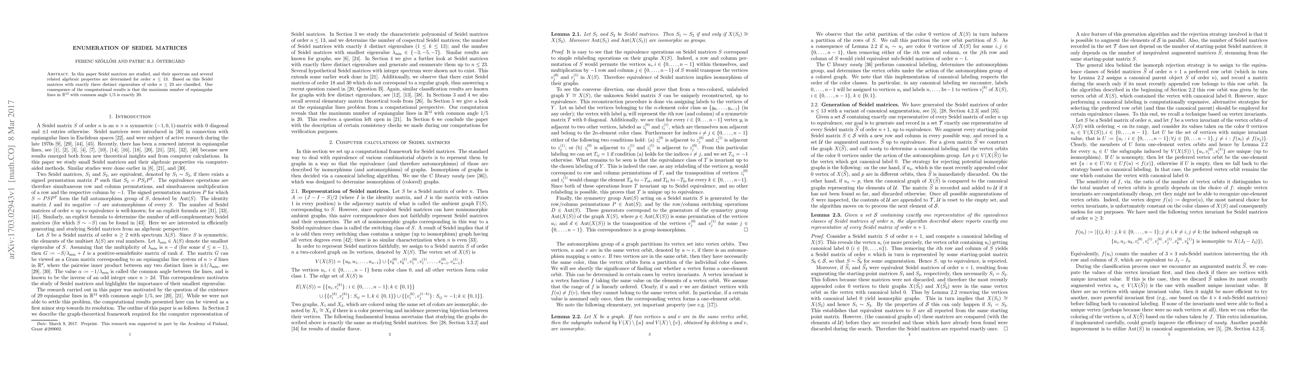 This paper enumerates Seidel matrices up to order 13, determining their spectrum and algebraic properties, and classifies those with exactly three distinct eigenvalues up to order 23. It concludes that the maximum number of equiangular lines in $\mathbb{R}^{12}$ with a common angle of $1/5$ is 20.