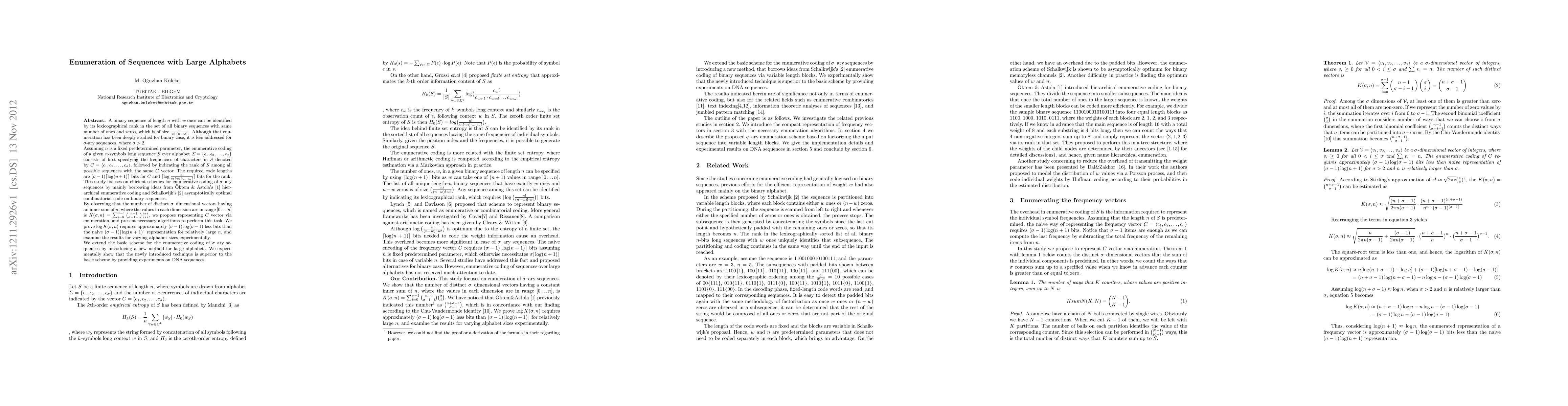 This study focuses on efficient schemes for enumerative coding of $\sigma$--ary sequences by mainly borrowing ideas from \"Oktem & Astola's \cite{Oktem99} hierarchical enumerative coding and Schalkwijk's \cite{Schalkwijk72} asymptotically optimal combinatorial code on binary sequences. By observing that the number of distinct $\sigma$--dimensional vectors having an inner sum of $n$, where the values in each dimension are in range $[0...n]$ is $K(\sigma,n) = \sum_{i=0}^{\sigma-1} {{n-1} \choose {\sigma-1-i}} {{\sigma} \choose {i}}$, we propose representing $C$ vector via enumeration, and present necessary algorithms to perform this task. We prove $\log K(\sigma,n)$ requires approximately $ (\sigma -1) \log (\sigma-1) $ less bits than the naive $(\sigma-1)\lceil \log (n+1) \rceil$ representation for relatively large $n$, and examine the results for varying alphabet sizes experimentally. We extend the basic scheme for the enumerative coding of $\sigma$--ary sequences by introducing a new method for large alphabets. We experimentally show that the newly introduced technique is superior to the basic scheme by providing experiments on DNA sequences.