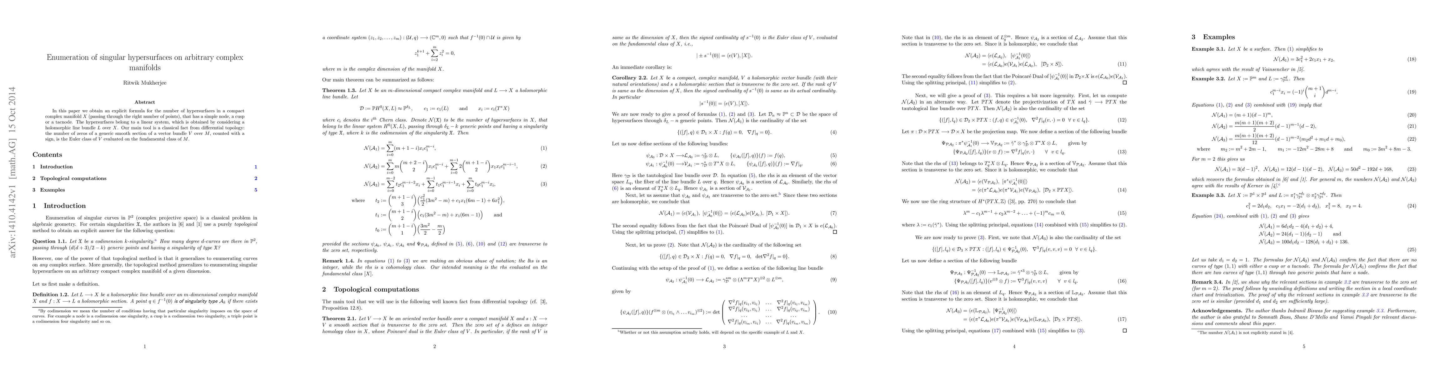 This paper derives an explicit formula for counting singular hypersurfaces on compact complex manifolds with specific types of singularities, using the Euler class of a related holomorphic line bundle.