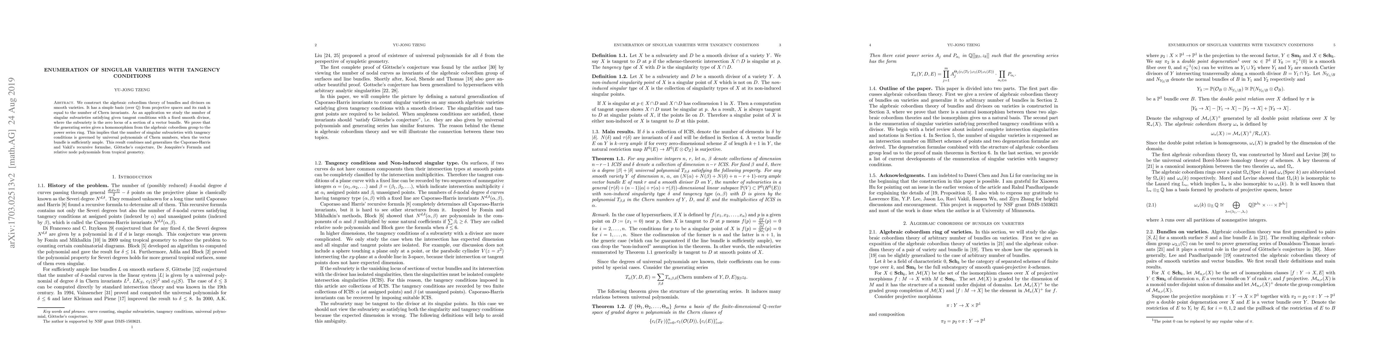 We construct the algebraic cobordism theory of bundles and divisors on smooth varieties. It has a simple basis (over Q) from projective spaces and its rank is equal to the number of Chern invariants. As an application we study the number of singular subvarieties satisfying given tangent conditions with a fixed smooth divisor, where the subvariety is the zero locus of a section of a vector bundle. We prove that the generating series gives a homomorphism from the algebraic cobordism group to the power series ring. This implies that the number of singular subvarieties with tangency conditions is governed by universal polynomials of Chern numbers, when the vector bundle is sufficiently ample. This result combines and generalizes the Caporaso-Harris and Vakil's recursive formulae, Gottsche's conjecture, De Jonquiere's Formula and relative node polynomials from tropical geometry. In the revised version, we allow the tangency conditions to be at assigned and unassigned points and prove the existence of universal polynomials and a formula for generating series. This completes the most general case of such enumeration of singular varieties for any dimension. We also correct the proof in Section 5, 6 when the divisor D is not irreducible, and Theorem 2.2. Typos are corrected.