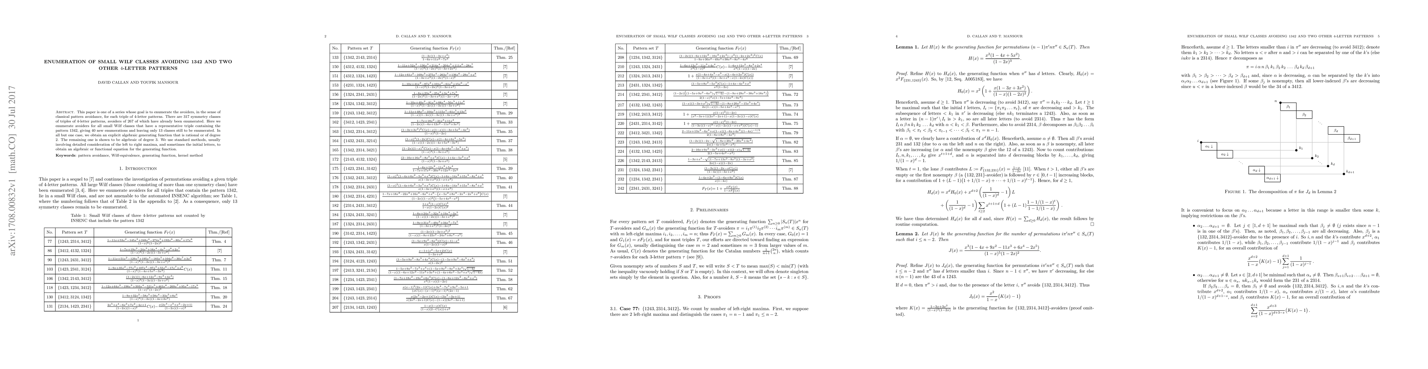 This paper enumerates avoiders for small Wilf classes that avoid the pattern 1342 and two other 4-letter patterns, contributing 40 new enumerations and leaving 13 classes remaining. Most enumerations yield rational or degree 2 algebraic generating functions, with one exception being algebraic of degree 3.
