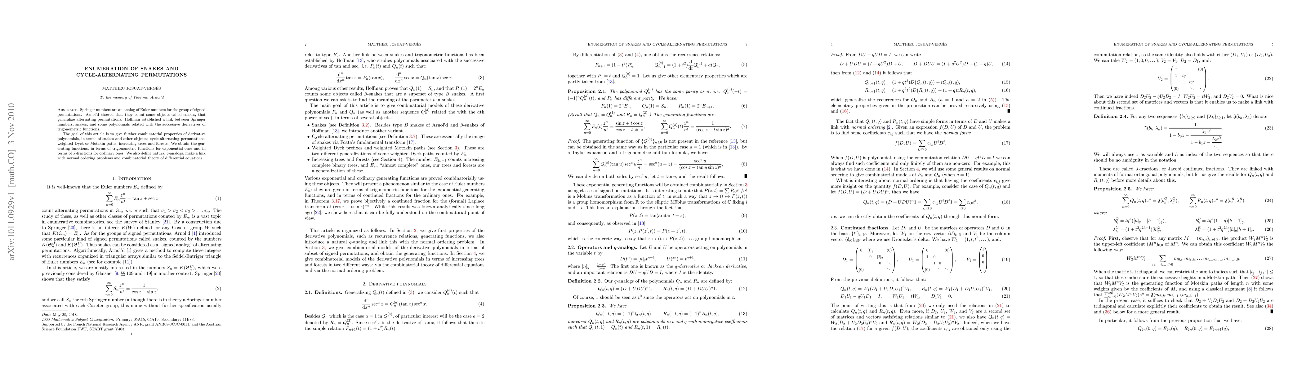 The research presents a comprehensive study of snakes and cycle-alternating permutations, offering new combinatorial models and connections to differential equations, normal ordering, and J-fractions, which distinguish it from previous work on alternating permutations.