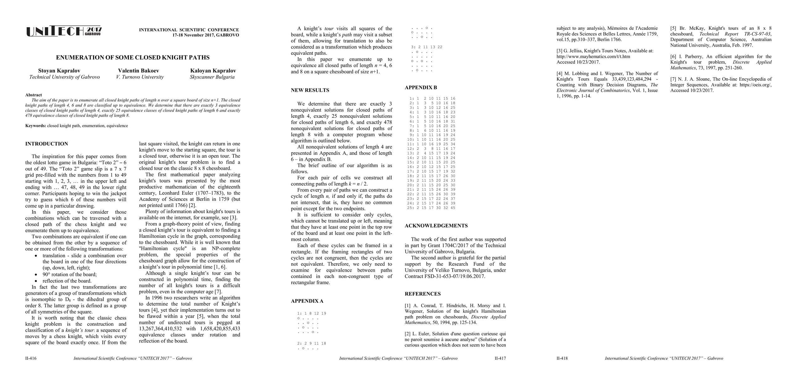 This paper enumerates closed knight paths of lengths 4, 6, and 8 on an n+1 square board, classifying them up to equivalence. It finds 3 equivalence classes for length 4, 25 for length 6, and 478 for length 8.