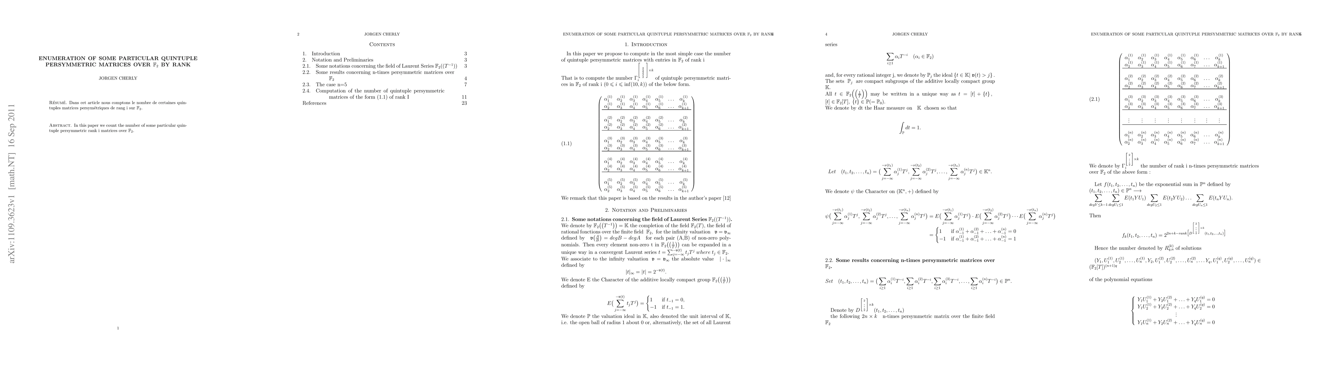 Summary: This paper enumerates the number of specific quintuple persymmetric matrices of rank i over the finite field F_2. The study focuses on the structural properties and distribution of these matrices.