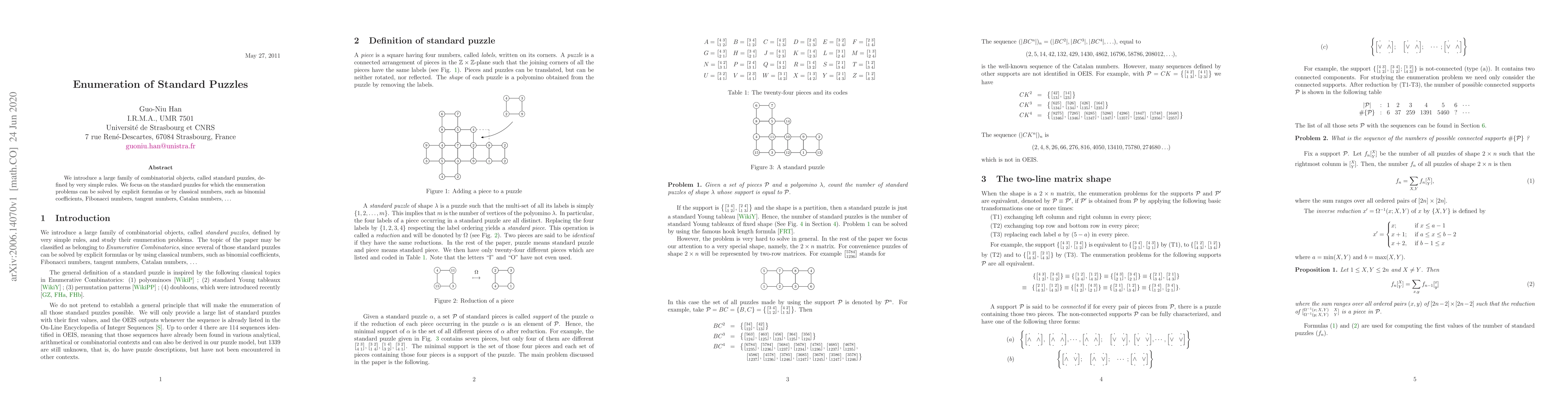 This paper introduces a new class of combinatorial objects called standard puzzles, characterized by simple rules. It presents explicit enumeration formulas using classical numbers like binomial coefficients, Fibonacci numbers, and Catalan numbers.