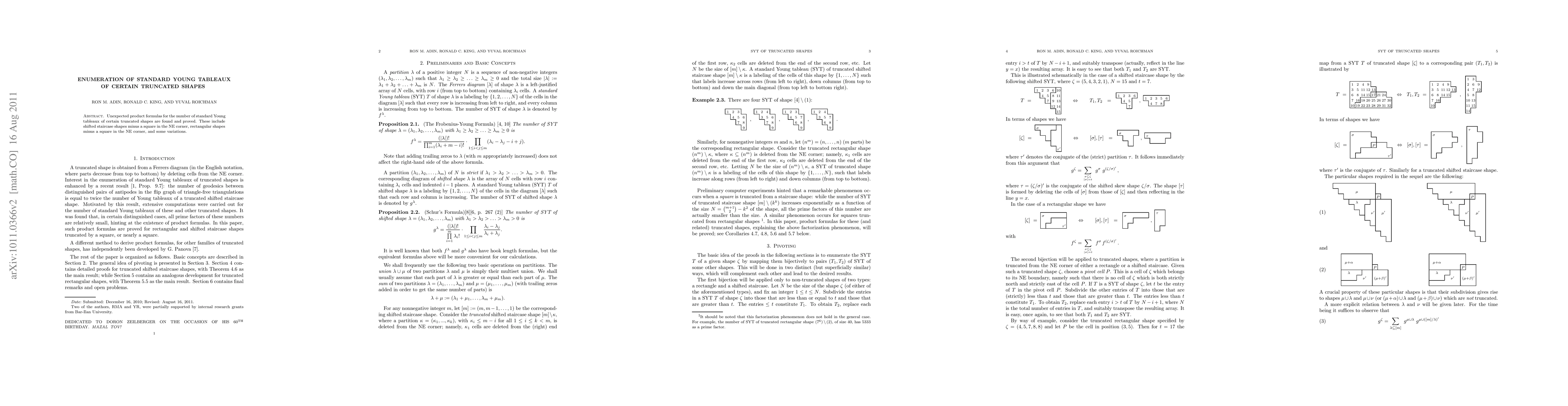 This paper identifies and proves unexpected product formulas for the enumeration of standard Young tableaux of specific truncated shapes, including shifted staircase shapes and rectangular shapes with a square removed from the northeast corner.