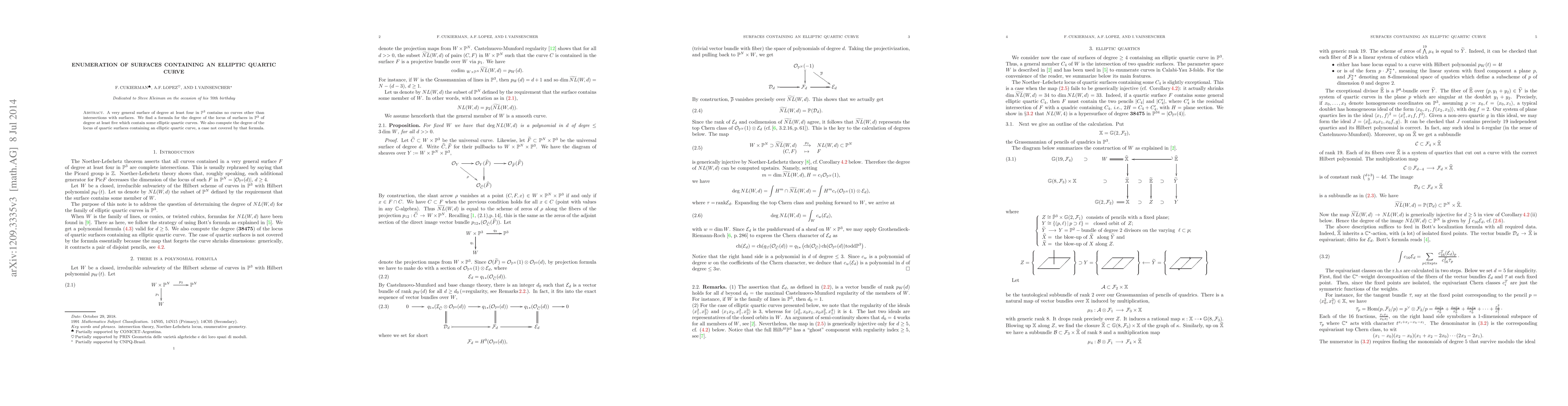 Researchers found a formula for surfaces of degree at least five containing elliptic quartic curves, but also calculated the degree of surfaces containing a specific curve case not covered by that formula.