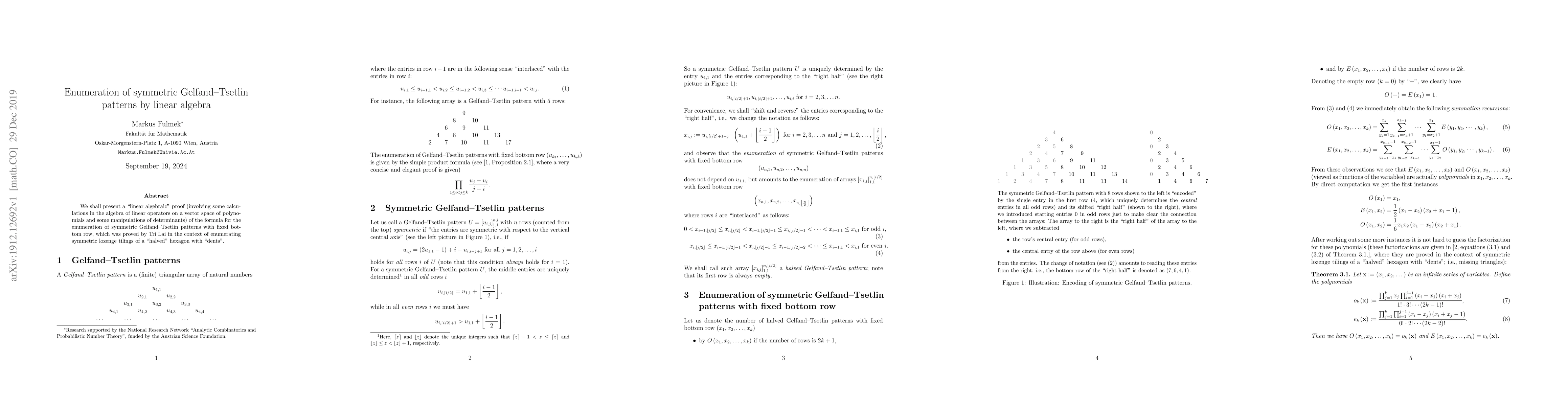We shall present a ``linear algebraic'' proof (involving some calculations in the algebra of linear operators on a vector space of polynomials and some manipulations of determinants) of the formula for the enumeration of symmetric Gelfand--Tsetlin patterns with fixed bottom row, which was proved by Tri Lai in the context of enumerating symmetric lozenge tilings of a ``halved'' hexagon with ``dents''.