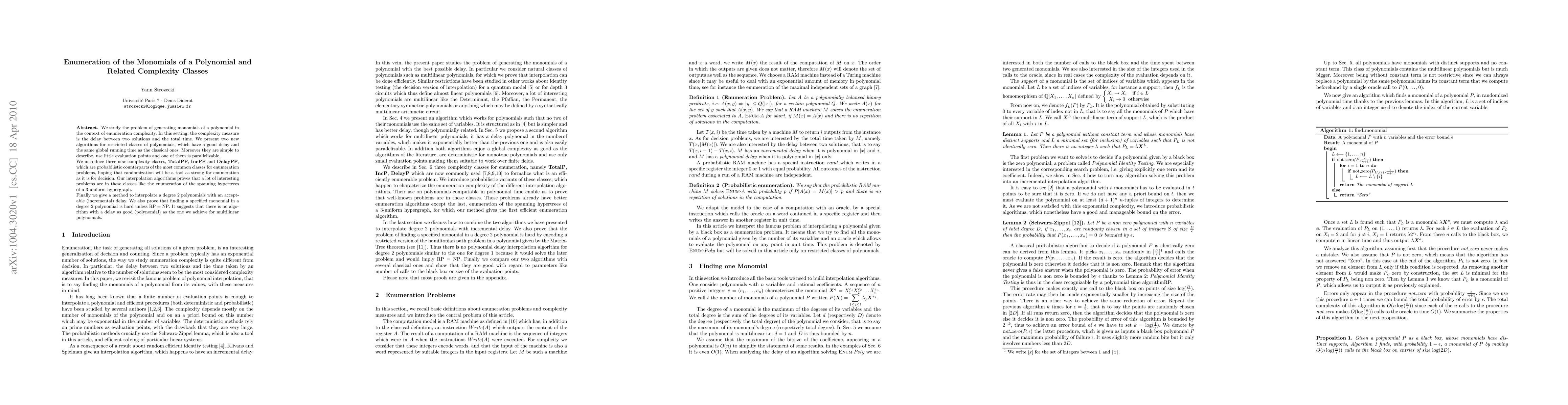 This paper introduces two new algorithms for efficiently generating monomials of polynomials with favorable delay and running time characteristics, suitable for restricted classes of polynomials. It also proposes three new complexity classes, TotalPP, IncPP, and DelayPP, to explore probabilistic enumeration complexity, demonstrating their relevance through interpolation algorithms and complexity results.